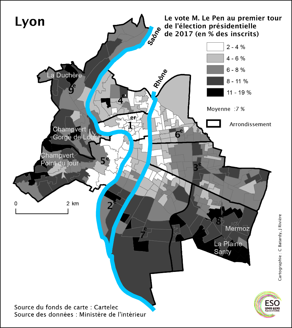 Globalement, les résultats du premier tour de la présidentielle 2017 à Lyon sont comparables à ceux des grandes villes où l’essentiel des quartiers populaires se situe hors de la ville-centre. Le 7 mai, pour le second tour, la ville de Lyon a voté à plus de 84 % des suffrages exprimés pour Emmanuel Macron (mais seulement 58 % des inscrits) et figure également dans la liste des grandes villes où le score du nouveau président dépasse les 80 % des exprimés (Paris, Rennes, Bordeaux, etc.). En cela, Lyon est une grande ville comme les autres (plus proches, cependant, de Paris que de Marseille). Mais l’analyse de la géographie des votes du premier tour des principaux candidats montre aussi, au côté d’une sédimentation des comportements politiques associés aux populations les plus anciennes de la ville, l’émergence à Lyon de nouveaux votes qui paraissent étroitement liés à l’installation de nouvelles populations dans de nouveaux quartiers. Pour mieux saisir les enjeux socio-politiques de la métropole de Lyon – la nouvelle organisation politico-administrative lyonnaise depuis le 1er janvier 2015 – il faudrait sans doute prolonger ces premières analyses, conduites ici seulement sur Lyon pour des raisons techniques de disponibilité des données (voir l’introduction générale du dossier), en observant de façon plus large les dynamiques urbaines, sociales et politiques dans les autres espaces qui la composent.