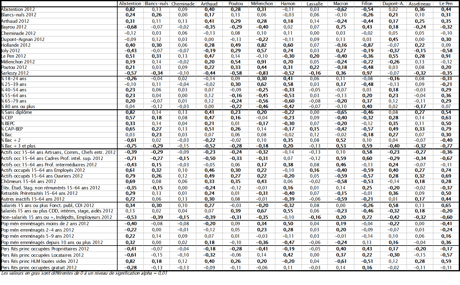 Annexe 1. Quelques précisions méthodologiques Comme l’ensemble des articles de ce dossier thématique « Élection présidentielle : le vote des grandes villes françaises au microscope », les analyses proposées par les auteurs sont appuyées sur des cartes réalisées par Christophe Batardy (ingénieur d’études CNRS – UMR ESO) à l’échelle des bureaux de vote [3]. Les fonds de carte des bureaux de l’ensemble des villes au sommaire du dossier ont été produits grâce au travail d’actualisation de la base de données CARTELEC mené par Céline Colange (ingénieure de recherche CNRS – UMR IDEES). En complément de ces cartes, les auteurs ont pu mobiliser une matrice des corrélations statistiques (annexe 2) entre les comportements électoraux au premier tour du scrutin présidentiel de 2017, les votes observés au premier tour de la présidentielle de 2012 (de manière à pouvoir resituer politiquement les résultats), et quelques variables socio-économiques diffusées par l’INSEE (de manière à pouvoir éclairer sociologiquement les résultats). Le problème d’inadéquation entre ces trois fonds de carte (découpage des bureaux en 2017, tracé des bureaux en 2012, périmètre des IRIS de l’INSEE en 2014) a été résolu par la ventilation de l’ensemble des données dans la maille spatiale des bureaux millésimés 2017, en s’inspirant de travaux développés dans le cadre de l’ANR CARTELEC (Beauguitte et Colange 2013) [4]. La production des matériaux cartographiques et statistiques a été coordonnée par Jean Rivière. Annexe 2. Matrice des corrélations |
