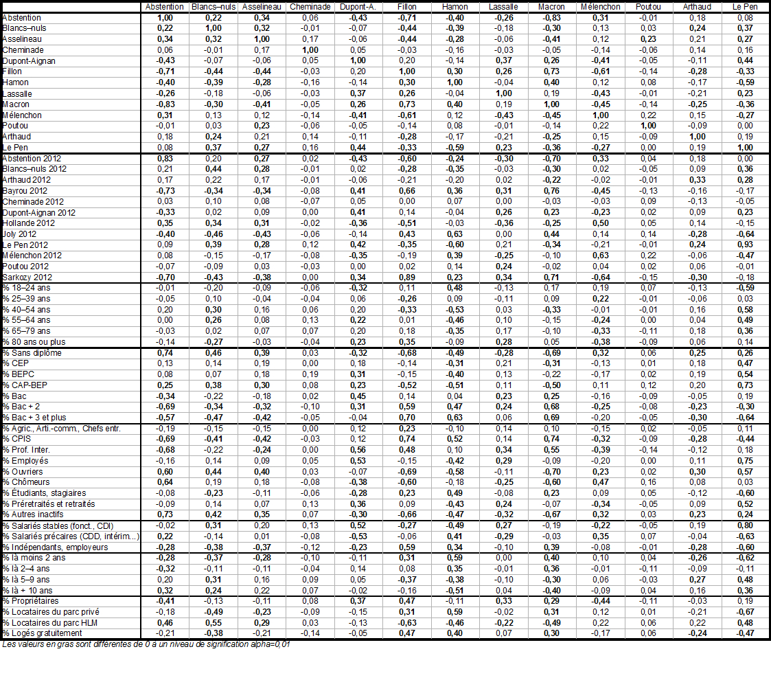 | Annexe 1. Quelques précisions méthodologiques Comme l’ensemble des articles de ce dossier thématique « Élection présidentielle : le vote des grandes villes françaises au microscope », les analyses proposées par les auteurs sont appuyées sur des cartes réalisées par Christophe Batardy (ingénieur d’études CNRS – UMR ESO) à l’échelle des bureaux de vote [2]. Les fonds de carte des bureaux de l’ensemble des villes au sommaire du dossier ont été produits grâce au travail d’actualisation de la base de données CARTELEC mené par Céline Colange (ingénieure de recherche CNRS – UMR IDEES). En complément de ces cartes, les auteurs ont pu mobiliser une matrice des corrélations statistiques (annexe 2) entre les comportements électoraux au premier tour du scrutin présidentiel de 2017, les votes observés au premier tour de la présidentielle de 2012 (de manière à pouvoir resituer politiquement les résultats), et quelques variables socioéconomiques diffusées par l’INSEE (de manière à pouvoir éclairer sociologiquement les résultats). Le problème d’inadéquation entre ces trois fonds de carte (découpage des bureaux en 2017, tracé des bureaux en 2012, périmètre des IRIS de l’INSEE en 2014) a été résolu par la ventilation de l’ensemble des données dans la maille spatiale des bureaux millésimés 2017, en s’inspirant de travaux développés dans le cadre de l’ANR CARTELEC (Beauguitte et Colange 2013) [3]. La production des matériaux cartographiques et statistiques a été coordonnée par Jean Rivière. Annexe 2. Matrice des corrélations  |