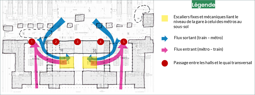 Dans le cas de la gare de l’Est, l’étude de l’ingénierie des flux montre que les trois-quarts des voyageurs de la gare sont des usagers de la ligne P du réseau Transilien. Chaque matin, plusieurs milliers de voyageurs sortent d’un même mouvement des trains, empruntent les escaliers mécaniques pour descendre d’un niveau et s’engouffrer dans les rames de métro.