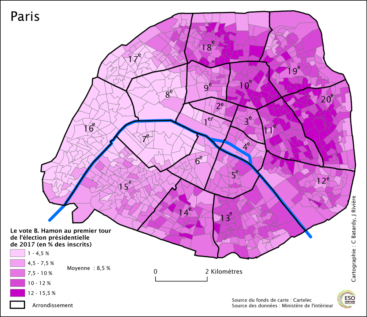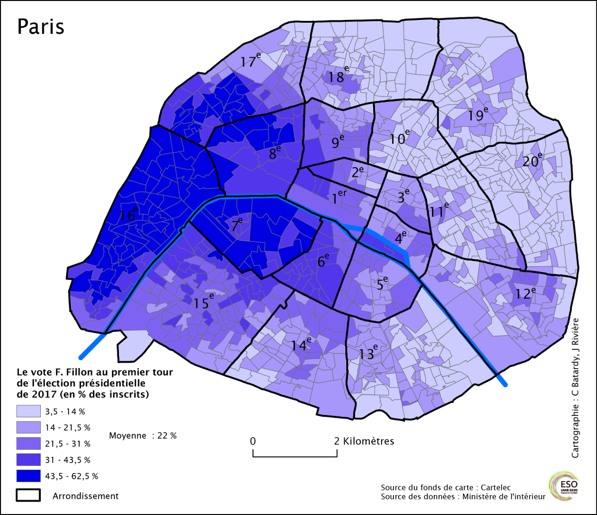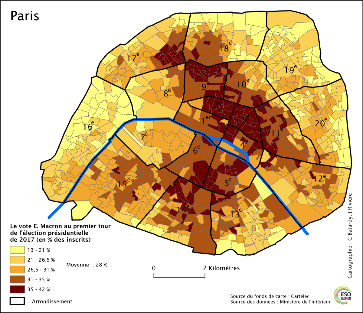 En première analyse, l’observation des cartes des résultats des principaux candidats à Paris semble confirmer certaines de ces hypothèses. À la double exception, certes notables, de la forte mobilisation des électeurs parisiens (seulement 16,1 % d’abstention contre 19,8 % en moyenne nationale ; carte 1) et du résultat du FN, qui reste sous-représenté dans la capitale (avec 5 % des exprimés et 4,13 % des inscrits – soit 53 000 voix– M. Le Pen régresse même par rapport à 2012, où elle obtenait 61 000 voix), les autres grandes tendances observables au plan national sont là. Il faut d’abord souligner le recul historique du Parti socialiste : Benoît Hamon avec 10,2 % des exprimés et 8,4 % des inscrits – 109 550 voix –, obtient trois fois moins de voix que François Hollande en 2012 – 345 000 voix. Est également remarquable la forte croissance du vote pour Jean-Luc Mélenchon, qui, avec 19,6 % des suffrages exprimés (16,2 % des inscrits) et 210 548 voix, double son score de 2012 –110 000 voix. S’agissant de François Fillon (26,5 % des exprimés et 21,9 % des inscrits – 284 744 voix), si on observe un recul sensible (Nicolas Sarkozy obtenait, en 2012, 319 000 voix), celui-ci reste néanmoins limité et Les Républicains demeurent la seconde force politique de la capitale. Le score d’E. Macron, qui arrive largement en tête avec 34,8 % des exprimés, 28,8 % des inscrits, soit 375 006 voix, semble enfin confirmer l’hypothèse d’une candidature portée par les élites sociales, économiques et culturelles des centres-villes.