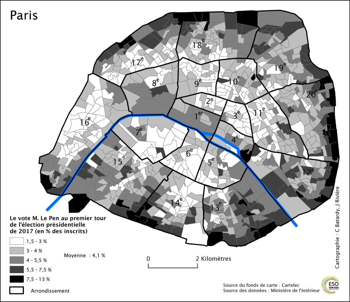 Dans quelle mesure ces interprétations déjà dominantes du scrutin, qui fleurissent depuis le 23 avril, résistent-elles à l’observation concrète, à partir des bureaux de votes, des résultats et de leur cartographie ? Le cas de Paris est particulièrement intéressant dans la mesure où la capitale constitue l’idéal-type de ces villes qui concentrent les élites sociales, économiques et culturelles et qui revendiquent une ouverture sur le monde constitutive de ce que l’on nomme la globalisation. Le recours à l’échelle des 896 bureaux de vote parisiens permet de porter un regard fin sur les dynamiques électorales intra-urbaines observées dans la capitale (annexe 1), dans le prolongement de travaux anciens en science politique (Goguel 1951 ; Ranger 1977) ou de recherches plus récentes en géographie (Rivière 2012 ; Beauguitte et Lambert 2014).