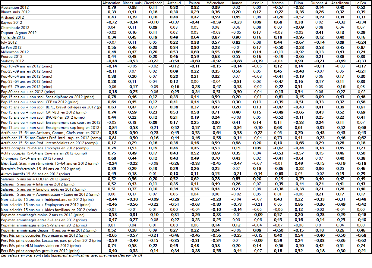 Annexe 1. Quelques précisions méthodologiques Comme l’ensemble des articles de ce dossier thématique « Élection présidentielle : le vote des grandes villes françaises au microscope », les analyses proposées par les auteurs sont appuyées sur des cartes réalisées par Christophe Batardy (ingénieur d’études CNRS – UMR ESO) à l’échelle des bureaux de vote [2]. Les fonds de carte des bureaux de l’ensemble des villes au sommaire du dossier ont été produits grâce au travail d’actualisation de la base de données CARTELEC mené par Céline Colange (ingénieure de recherche CNRS – UMR IDEES). En complément de ces cartes, les auteurs ont pu mobiliser une matrice des corrélations statistiques (annexe 2) entre les comportements électoraux au premier tour du scrutin présidentiel de 2017, les votes observés au premier tour de la présidentielle de 2012 (de manière à pouvoir resituer politiquement les résultats), et quelques variables socioéconomiques diffusées par l’INSEE (de manière à pouvoir éclairer sociologiquement les résultats). Le problème d’inadéquation entre ces trois fonds de carte (découpage des bureaux en 2017, tracé des bureaux en 2012, périmètre des IRIS de l’INSEE en 2014) a été résolu par la ventilation de l’ensemble des données dans la maille spatiale des bureaux millésimés 2017, en s’inspirant de travaux développés dans le cadre de l’ANR CARTELEC (Beauguitte et Colange 2013) [3]. La production des matériaux cartographiques et statistiques a été coordonnée par Jean Rivière. Annexe 2. Matrice des corrélations |