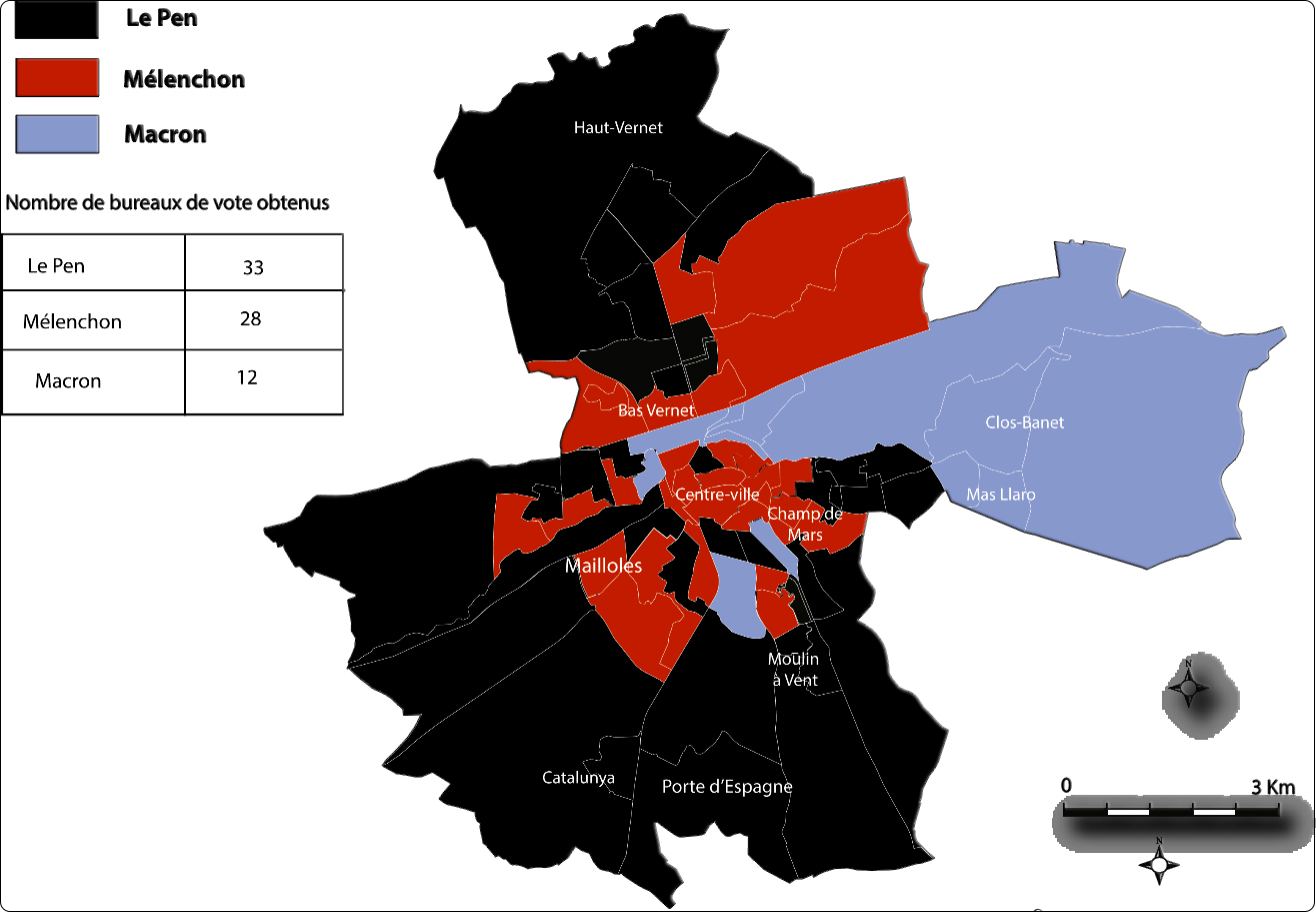 D’autre part, se consolide le vote stratège de la bourgeoisie locale. Si celle-ci a soutenu L. Aliot lors des dernières municipales, rassurée par une orientation somme toute libérale du projet municipal (faible fiscalité locale, aides aux commerçants en centre-ville), elle reste rétive à accorder son vote à M. Le Pen, représentant à ses yeux un illibéralisme nocif. Cette contradiction n’en reste pas moins stratégique pour une catégorie sociale toujours soucieuse de défendre ses intérêts.