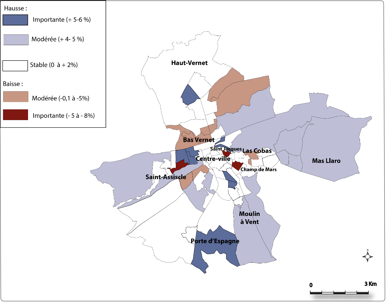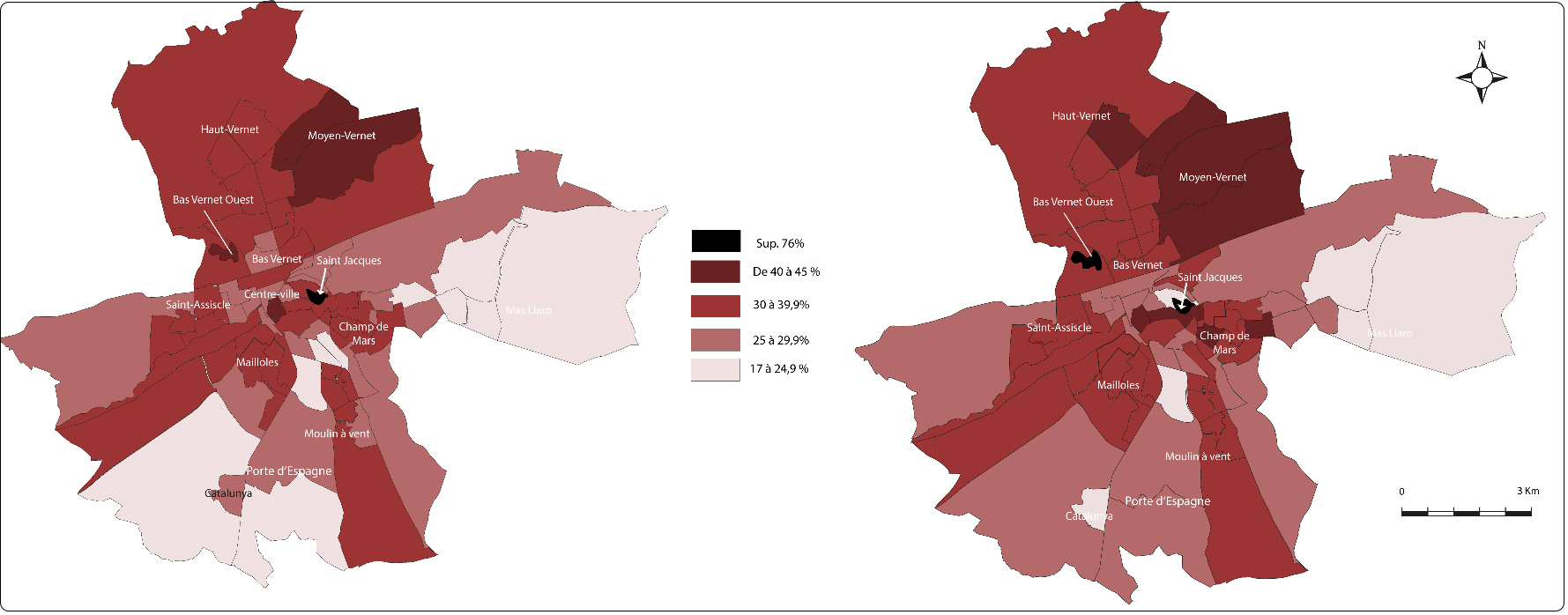 La concurrence d’autres candidatures semble avoir été particulièrement forte. Dans la ville de L. Aliot, le vote pour Éric Zemmour (9,6 %) est ainsi supérieur aux moyennes nationales (7,1 %) et régionales (7,7 %, figure 2). Si aucun quartier n’a placé É. Zemmour en tête, ses scores les plus élevés (12 à 16 %) se situent dans les faubourgs des ouvriers et des employés (Las Cobas, La Lunette), grands oubliés des politiques urbaines de ces dernières décennies, et dont les habitants ont radicalisé un peu plus leur vote. Le plus surprenant est la percée du vote en faveur de J.-L. Mélenchon (25,7 %) qui, à l’échelle de la ville, talonne celui pour M. Le Pen et progresse depuis 2017. L’ensemble dessine une carte électorale (figures 1 et 3) qui reprend les tendances observées depuis 2017, mais avec des évolutions sensibles (tableau 2).