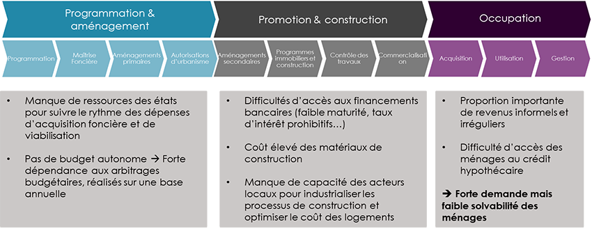 - des difficultés d’ordre organisationnel : absence d’aménageurs et manque d’expérience des États dans le pilotage de projets urbains de grande envergure, défaut de capacité des promoteurs qui peinent à industrialiser leurs procédés et à générer des économies d’échelle ;