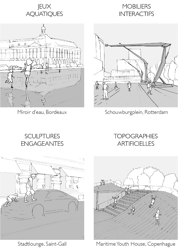 En nous appuyant sur un travail de thèse en cours [1], nous proposons une catégorisation des artefacts les plus courants favorisant des comportements ludiques, apparus récemment dans nos villes, selon quatre familles : jeux aquatiques, mobilier interactif, sculptures engageantes et topographies artificielles (cf. figure 1).