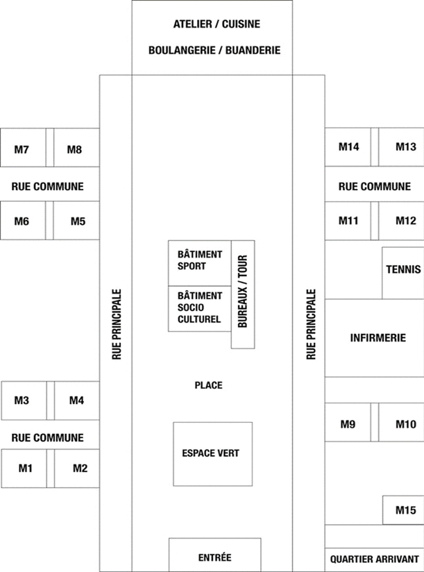 L’espace s’organise à partir d’un modèle pavillonnaire en intégrant les codes de la ville (figures 1 et 2). L’établissement est entièrement à ciel ouvert, en dehors des bâtiments « d’hébergement » et « d’équipements ». Au centre, on trouve une « grande place aménagée » avec de vastes espaces verts et des sculptures (figure 3). Comme dans le bourg villageois, la place se veut « espace de socialisation ». La tour de contrôle, trônant au milieu, pourrait presque s’apparenter au clocher du village. « Dans cette ville », l’espace est aménagé de façon orthogonale avec les « zones de résidence » sur les côtés et celles dédiées aux « équipements » au centre, séparées par deux axes de circulation appelés « rues principales ».