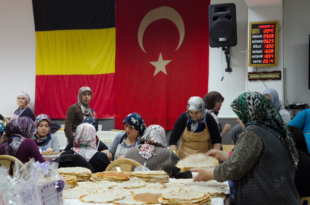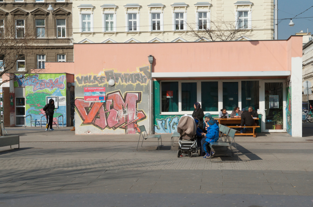 La balade a un point de départ. Elle commence dans une rue, dans une place ou alors dans une boutique ou dans un salon marocain. Tout au long de l’exposition, nous découvrons des formes ordinaires d’entraide, d’hospitalité et de plaisir dans des cafés, restaurants rapides, commerces bon marché, marchés, associations, jardins ouvriers, squares, cafés sociaux et lieux de culte qui sont riches en échanges humains. Les lieux de culte sont tantôt présentés comme étant inhérents au quotidien (église catholique de Bruxelles), tantôt pointés comme preuve d’un « esprit de lieu pluraliste » (l’église protestante de Vienne), tantôt comme lieu de résolution des tensions locales avec la municipalité (la salle de prière associée au projet cultuel de l’Institut des cultures d’islam à Paris) [3]. C’est en revanche une ancienne pizzeria anarchiste (quartier de Volkert, Vienne), qui semble incarner davantage la violence incomprise, à la suite des interventions policières qui ont mis fin à cette expérience de convivialité. Souvent situés à proximité de lieux de circulation importants (gares et aussi arrêts de tram et stations de métro), ces quartiers sont mis en images de manière à évoquer la gentrification et ses rénovations, mais également des initiatives permettant de faire face à la pauvreté, à la dégradation des conditions d’emploi, de logement et de certains espaces publics. À pied comme à vélo, différents groupes d’âge (même si les personnes âgées sont quasi inexistantes) et milieux sociaux se côtoient sans pour autant se rencontrer toujours, comme c’est notamment le cas dans la Volkertplatz à Vienne.