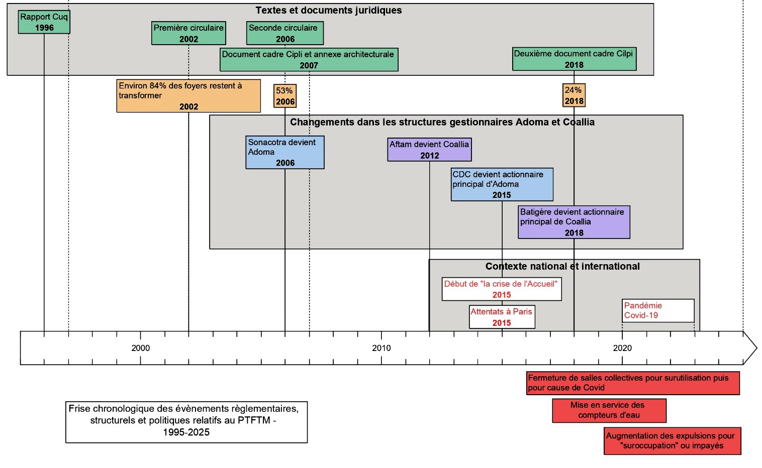 Les bâtiments qui sortent de terre aujourd’hui ne ressemblent pourtant en rien à ceux du début des années 2000 et les habitants font face à une augmentation des contraintes techniques et juridiques portant sur leurs manières d’habiter. Cet article retrace ainsi l’histoire de cette politique nationale en articulant deux volets trop souvent pensés séparément : d’une part, la transformation des ambitions architecturales et, de l’autre, l’évolution progressive des objectifs de peuplement [2] de ces bâtiments. Cette histoire à la fois juridique, politique et matérielle des foyers permet de souligner comment ces vingt-cinq dernières années ont été marquées par une intensification de la stigmatisation des populations qualifiées de « ouest-africaines », passant d’individus aux pratiques habitantes problématiques à population indésirable et menacée d’expulsion dans les nouvelles résidences [3].