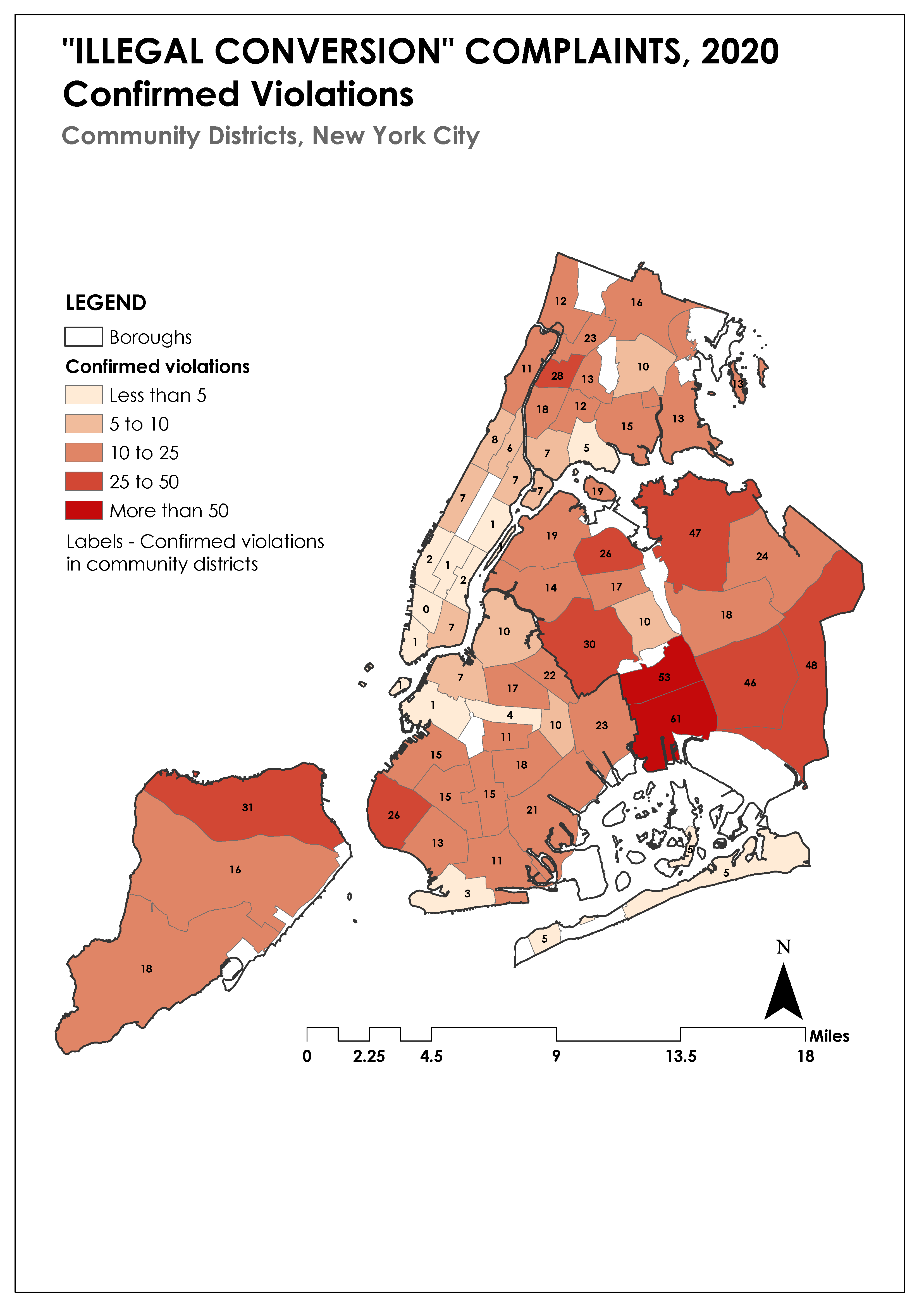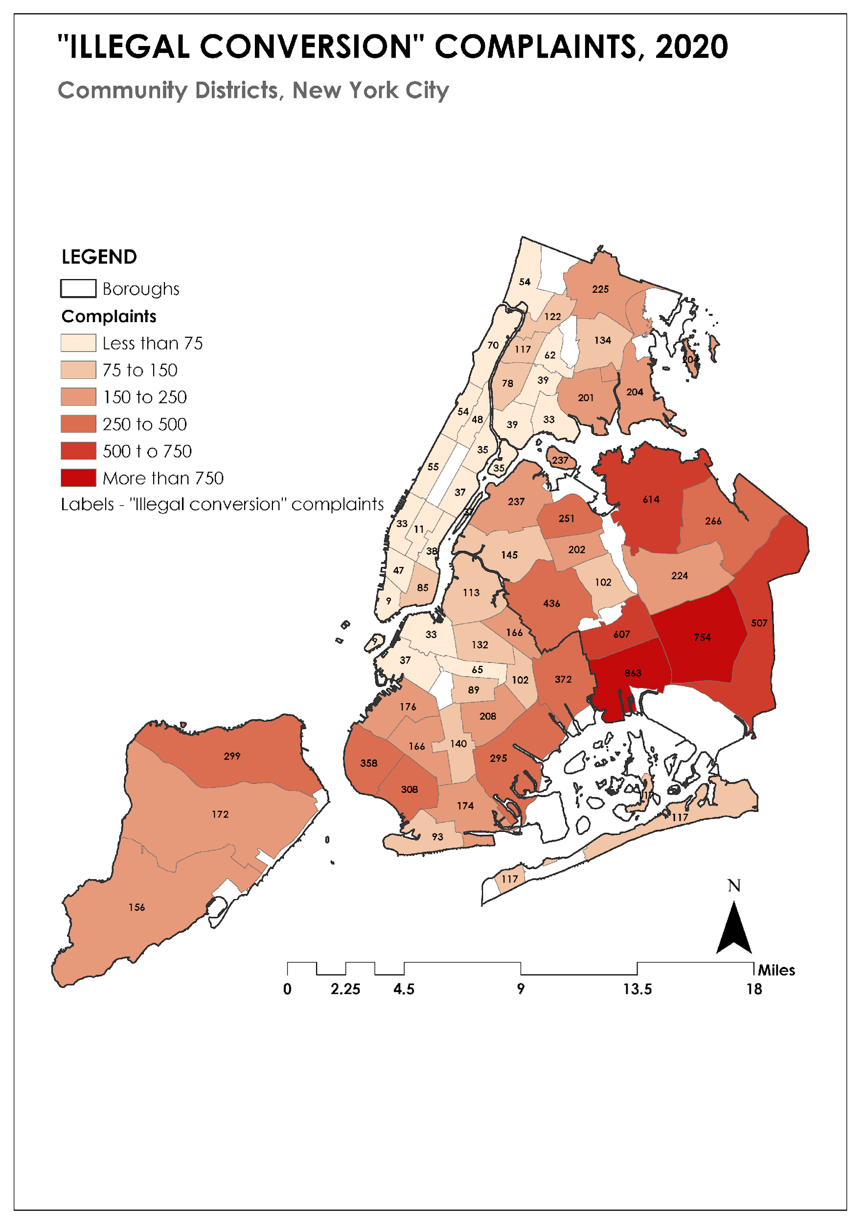 Interventions in the first phase aimed to eliminate illegal basement conversions, problematizing them primarily as a threat to safety. Examples from this phase include Queens borough president Helen Marshall’s Illegal Conversions Task Force, which took effect multiple times in the late 1990s and early 2000s, and city mayor Michael Bloomberg’s initiative in 2011 to rapidly identify and intervene with regard to illegal units that would be prone to fire accidents. These measures did not succeed in eliminating illegal conversions, nor did they substantially reduce their presence. The City received around 83,000 illegal conversion complaints between 2000 and 2009, and around 76,000 complaints in the following decade (Chhaya CDC 2021). The continued prevalence of basement conversions led to the second phase of official response.