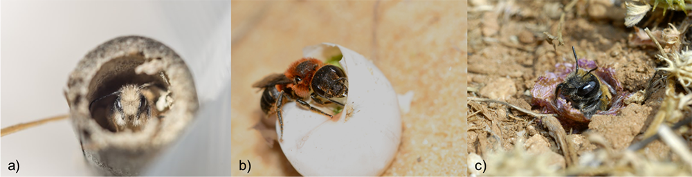 a) Osmia sp. cavicole (© B. Ignace) ; b) Osmia sp. hélicicole (© A. Muller) ; c) Hoplitis sp. terricole (© M. Aubert).