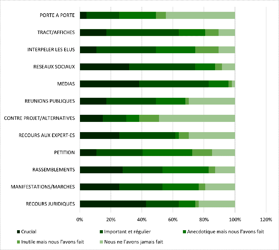 Les moyens d’action des opposant·es aux projets contestés ne peuvent être définis par leur caractère violent. Ils relèvent en fait d’un répertoire d’action assez classique, marqué des stratégies d’information (médias, réseaux sociaux), des mobilisations de rue (rassemblements, marches), une défiance relative vis-à-vis des élu·es (les pétitions et interpellations étant considérées comme importantes mais rarement cruciales) et un recours constant à la justice (figure 1), jugée cruciale dans plus de la moitié des cas de mobilisation étudiés. Pourtant, malgré de nombreuses victoires devant les tribunaux administratifs, les projets ne sont pas pour autant arrêtés. Parfois, ces victoires finissent par être défaites en Cours d’appel, d’autres fois elles sont tout simplement ignorées par les pouvoirs publics et/ou les aménageurs qui continuent les travaux, comme ce fut le cas pendant un certain temps aux jardins d’Aubervilliers, avant que la Mairie soit finalement condamnée [10].
