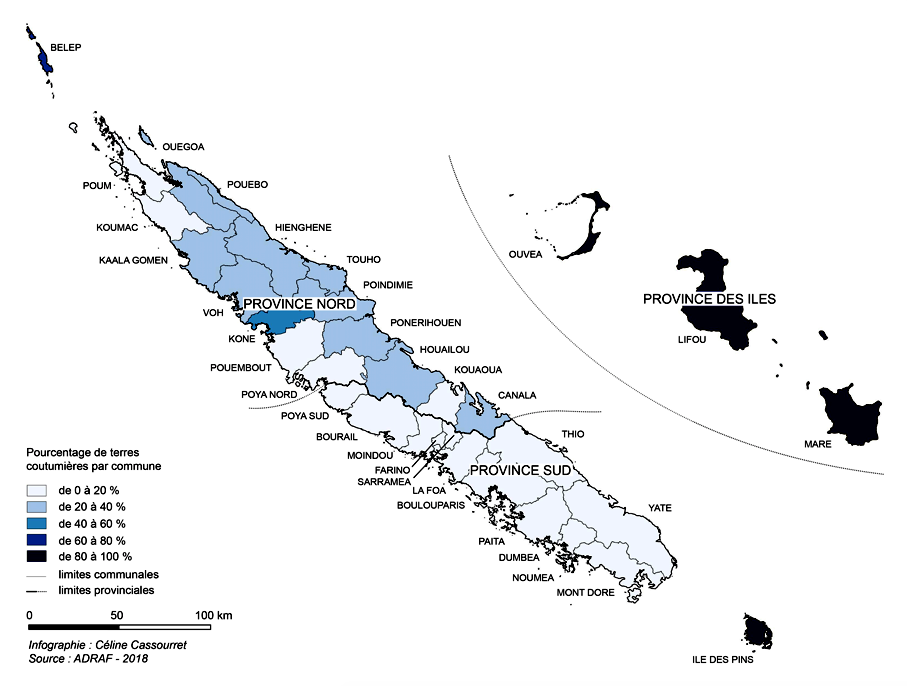 Ces caractéristiques de la gouvernance coutumière rapprochent la terre kanak de la notion de commun (Schlager et Oström 1992) : il s’agit d’un commun traditionnel redéfini par un encadrement institutionnel plus récent. Il permet un accès à la terre au sein d’une communauté, mais entre en discordance avec les mécanismes financiers et temporels actuels de l’aménagement (Herrenschmidt et Le Meur 2016). Or en 2018, les terres coutumières (figure 1) s’étendent sur près d’un tiers du territoire néocalédonien et appartiennent exclusivement aux populations autochtones, soit 40 % de la population (ISEE 2014). Elles constituent donc un enjeu important entre les populations kanak et non kanak.