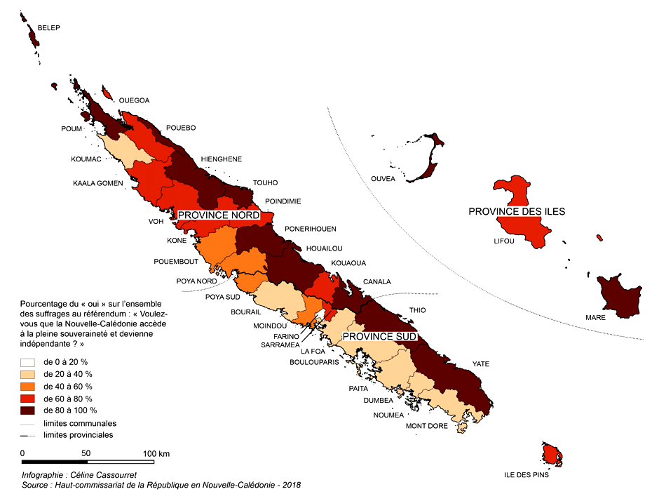 L’aménagement des terres coutumières kanak s’affirme donc comme l’un des enjeux majeurs de l’avenir de l’archipel. La cartographie du vote au référendum de 2018 (figure 6) montre que les clivages socio-territoriaux perdurent, malgré la prédominance du refus de l’indépendance de la Nouvelle-Calédonie (56 % des votes). En effet, les habitants des territoires en majorité coutumiers ont voté massivement « oui » à l’indépendance.