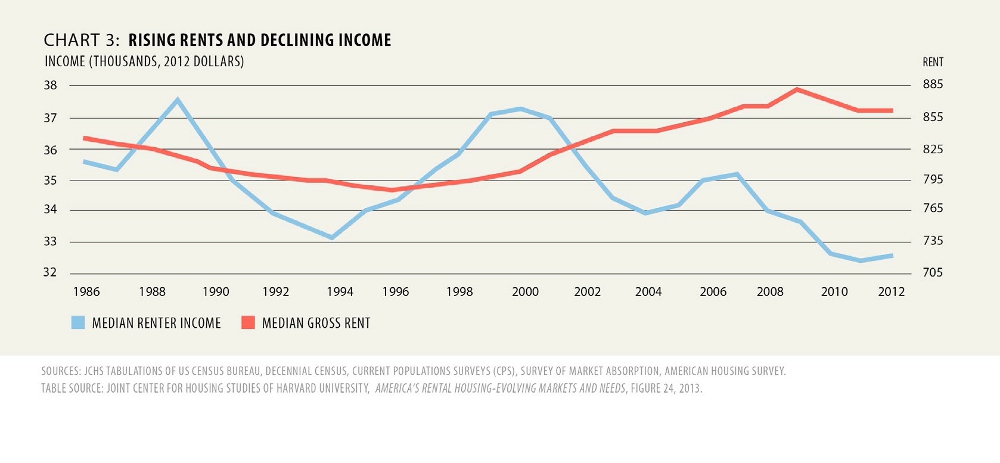Renters face a perfect storm of rising rents and falling wages, a severe shortage of affordable units, and increased competition as the number of renters grows. Rents have been increasing for the past 20 years and jumped 4% in each of the past two years alone (Abromowitz 2012). Over the period extending from 2000 to 2014, median household income has increased by 25.4%, while rents have increased by over 52.8%, more than twice as much (Rao 2014).