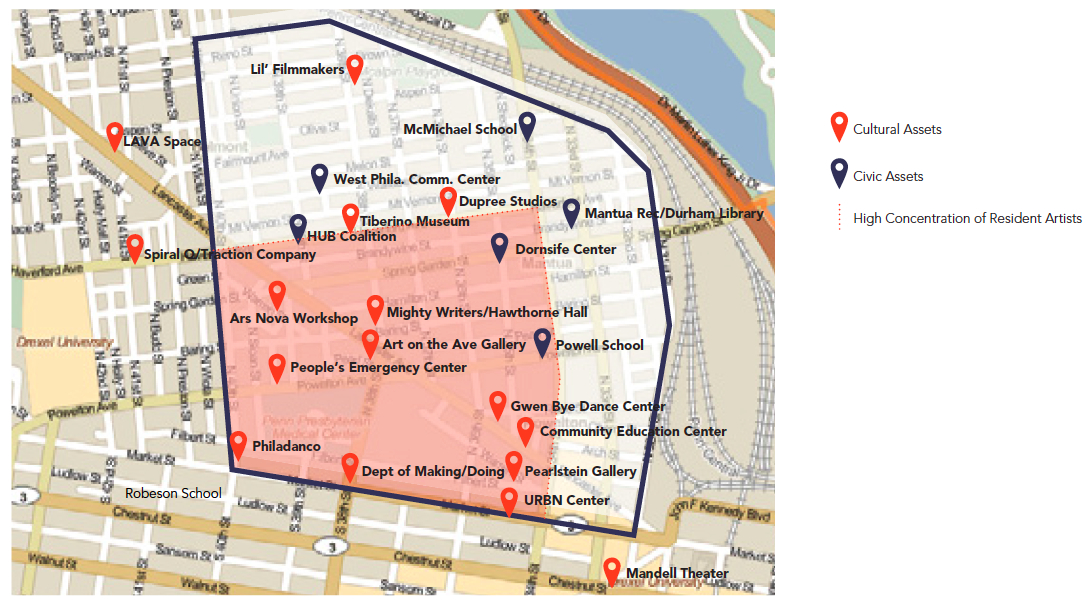 Many neighborhood and cultural and civic assets are located near and along Market Street, Lancaster Avenue, and Haverford Avenue. Artists are concentrated in the southern and western sections of the study area. (Source : CultureBlocks.com.)