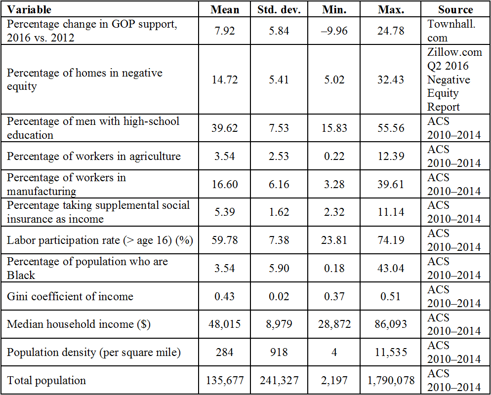 I assemble a county-level dataset of the change in GOP support between the 2012 and 2016 presidential elections. I look at whether factors like education, employment sector, racial demographics, and income can explain the association between negative equity and support for the Republican presidential candidate from 2012 to 2016. The data for this analysis are summarized in Table 1.