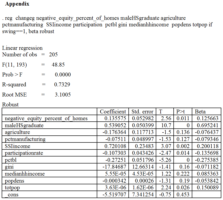 The results in Table 3 show how increases in each variable by one standard deviation affect support for the GOP presidential candidates from 2012 to 2016. The beta coefficient measure is useful because it shows the relative impact of variables, so we can see which variable is creating the largest change in GOP support from 2012 to 2016. In the first line, as the percentage of homes in negative equity increases by one standard deviation, or 5.41%, Trump outperforms Romney by 0.126 standard deviations, or 0.73%. This relationship is dwarfed by the effect of education, SSI income, and racial composition, but the effect is larger than our measures of labor sector, which are too close to zero to be significant. These results suggest that counties where most employees work in manufacturing or agriculture did not consistently see increases in support for the GOP ; if anything, these counties were more likely to reduce support for GOP candidates from 2012 to 2016. The results call into doubt the idea that sectoral change is the primary cause of support for the GOP, though since voting is not strictly a zero-sum game, it’s possible sectoral change is related to declining support for Clinton relative to Obama.