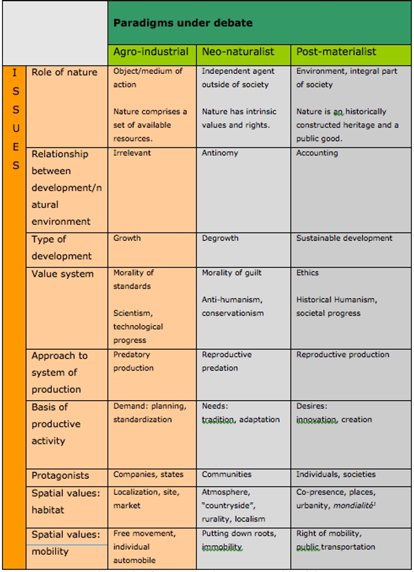 Those conceptions are summed up in the table below, which shows that the current debate is easier to grasp if we distinguish between three options – which, of course, are often presented in a muddled or inconsistent manner. We have tried to simplify as far as possible here by pushing each paradigm to its logical conclusion – at the risk, as always in such cases, of glossing over nuances and intermediate standpoints that do merit scrutiny. However, each of the conceptions in question exhibits a great deal of coherence, as reflected in the table : the agro-industrial, neo-naturalist and post-materialist models possess substantial resources for reflection not only on nature and development, but also on political and moral philosophy, various aspects of the social sphere (production system, social relations, space, time) and values, which, in all three cases, do seem to form a coherent system. This classification can help us understand how the urban relates to the debate over the role of nature in the future of society.