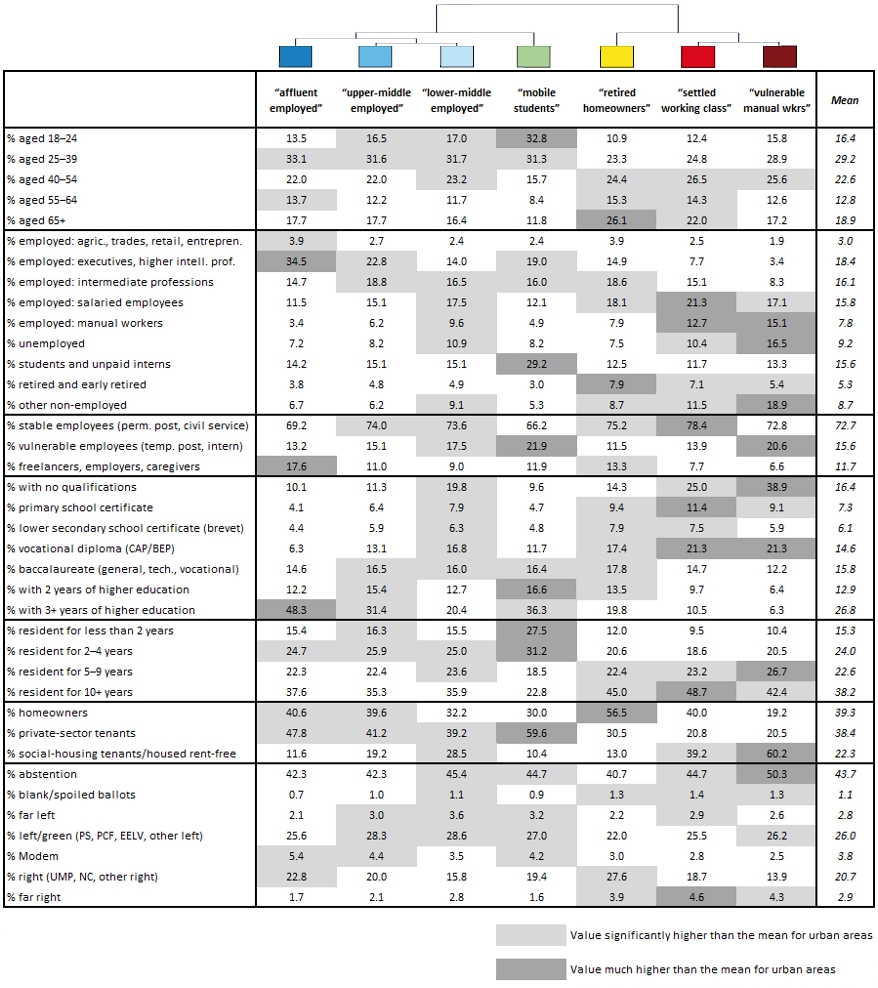 Given that not all political parties and groups were represented in each city, a typology was developed on the basis of the sociological profile of residents (defined by their age, their level of education, their socio-professional status within the population aged 15 to 64, the nature of their employment contract for those in employment, the length of time they have lived in the area, and the nature of their housing tenure). The aim of this typology was to help identify seven groups of polling districts. [6] The electoral profile of each group was then established : the maps below show their distribution across each of the cities, while the table in the annex presents a detailed description of their characteristics. While this approach has the advantage of providing a common overview of France’s major cities, it also has the disadvantage of “averaging out” the relationships between a neighbourhood’s social profile and its voting tendencies, which may be quite different – even diametrically opposed – from one city to another.