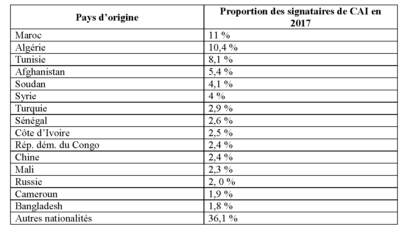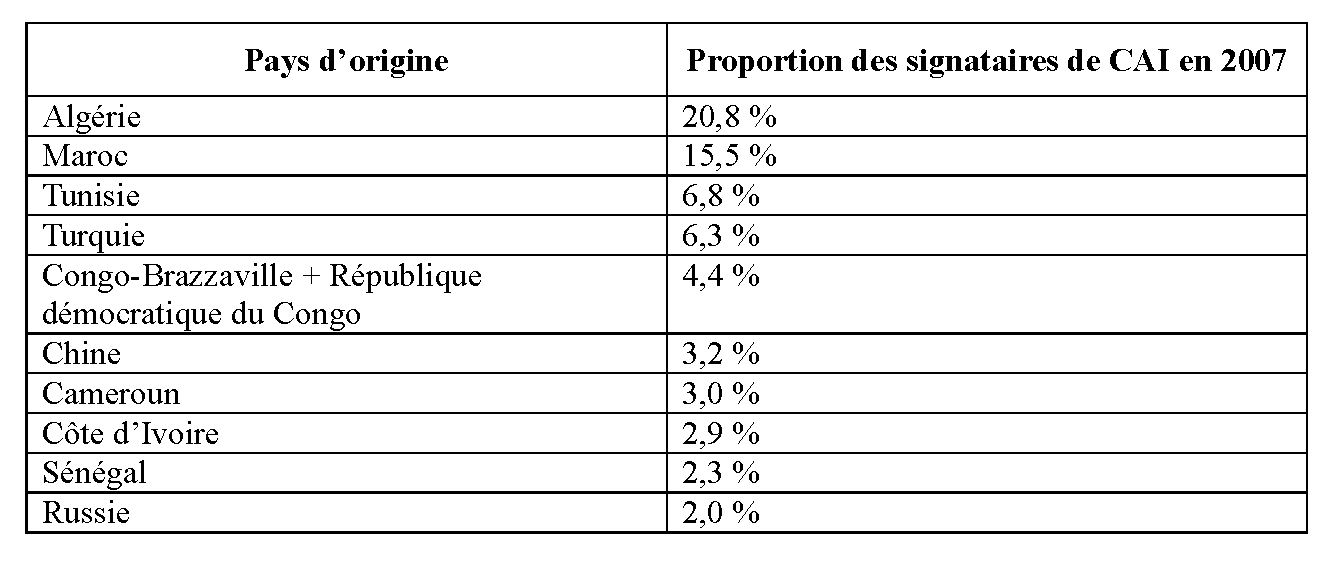 La comparaison des nationalités des signataires du CAI entre 2007 et 2017 est également révélatrice de la part centrale de cette immigration ordinaire même si, rappelons-le, le dispositif ne concerne pas les personnes issues de l’Union européenne. En 2007 (figure 3), 43,1 % des signataires du CAI sont originaires du Maghreb, puis de Turquie (6,3 %). Les personnes venant d’Afrique subsaharienne, notamment du Cameroun, des deux Congo, de Côte d’Ivoire, du Mali et du Sénégal représentent quant à elles 14,8 % des signataires ; les personnes originaires de Russie et des pays issus de l’ex-URSS forment 4,4 % du total et les Chinois 3,2 % (Secrétariat général du comité interministériel de contrôle de l’immigration 2008).