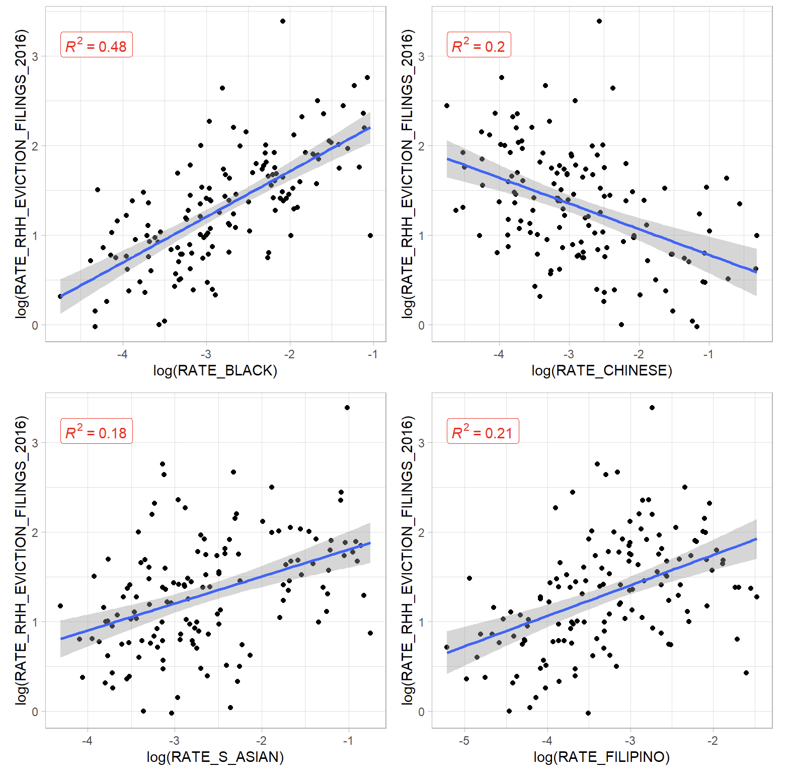 Our results reveal an interesting story. As the proportion of Black, South Asian, and Filipino households increases in a neighborhood, the rate of eviction filings increases as well. However, as the rate of Chinese households increases in a neighborhood, the rate of eviction filings decreases. These bivariate relationships illustrate the unevenness of eviction risk for racialized households across the City of Toronto. Further exploration through regression analysis (using a log–log function) reveals additional insights when controlling for local property and economic conditions. Table 2 highlights the differences, and relative importance, of racial identification.