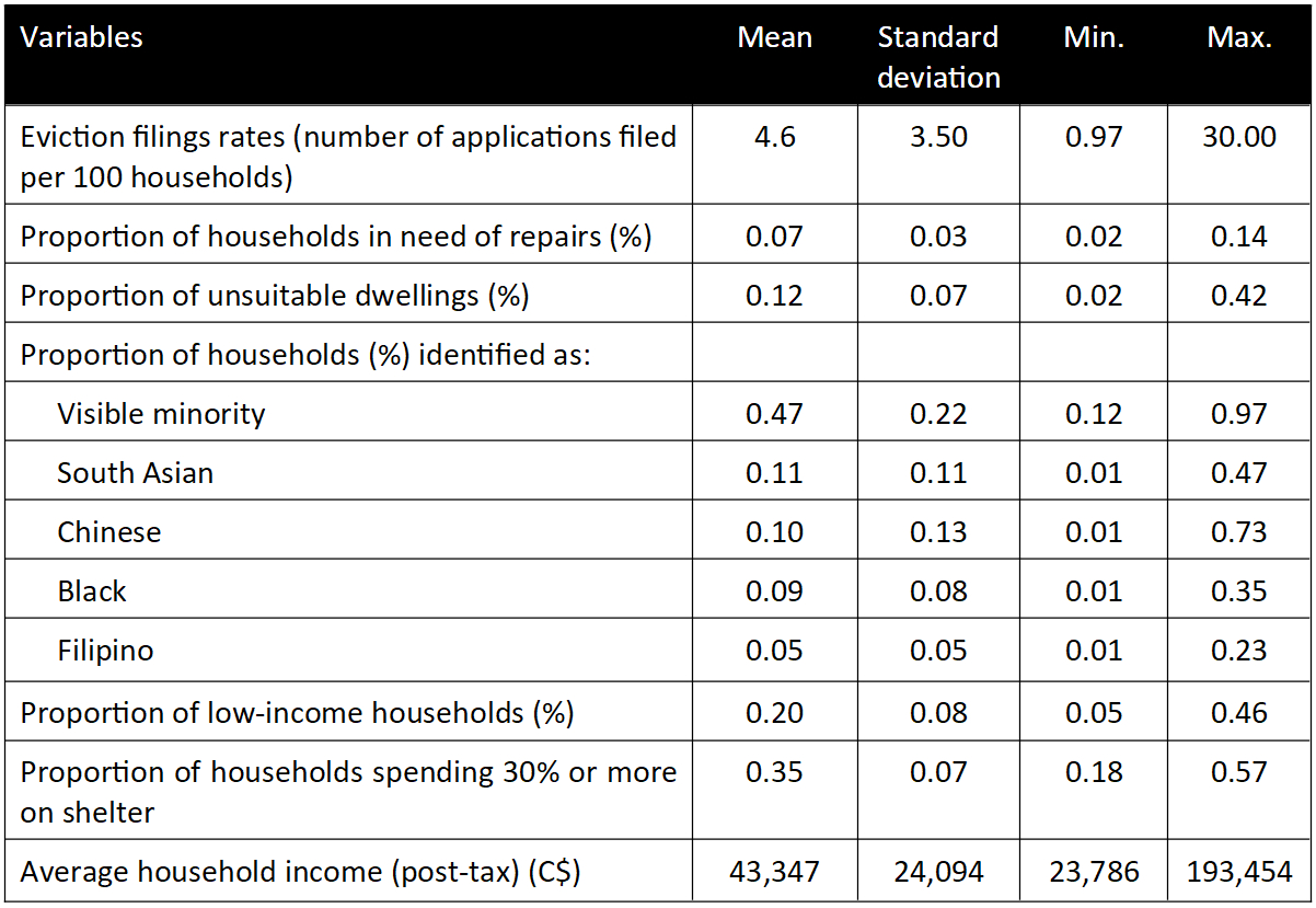 To illustrate the importance of racial identification, we compare the statistical significance of the “visible minority” classification versus more disaggregated racial identifiers. We focus on the relative composition of Black, Chinese, Filipino, and South Asian households, given their relative population size across the city. Table 1 provides the descriptive statistics for our analysis.