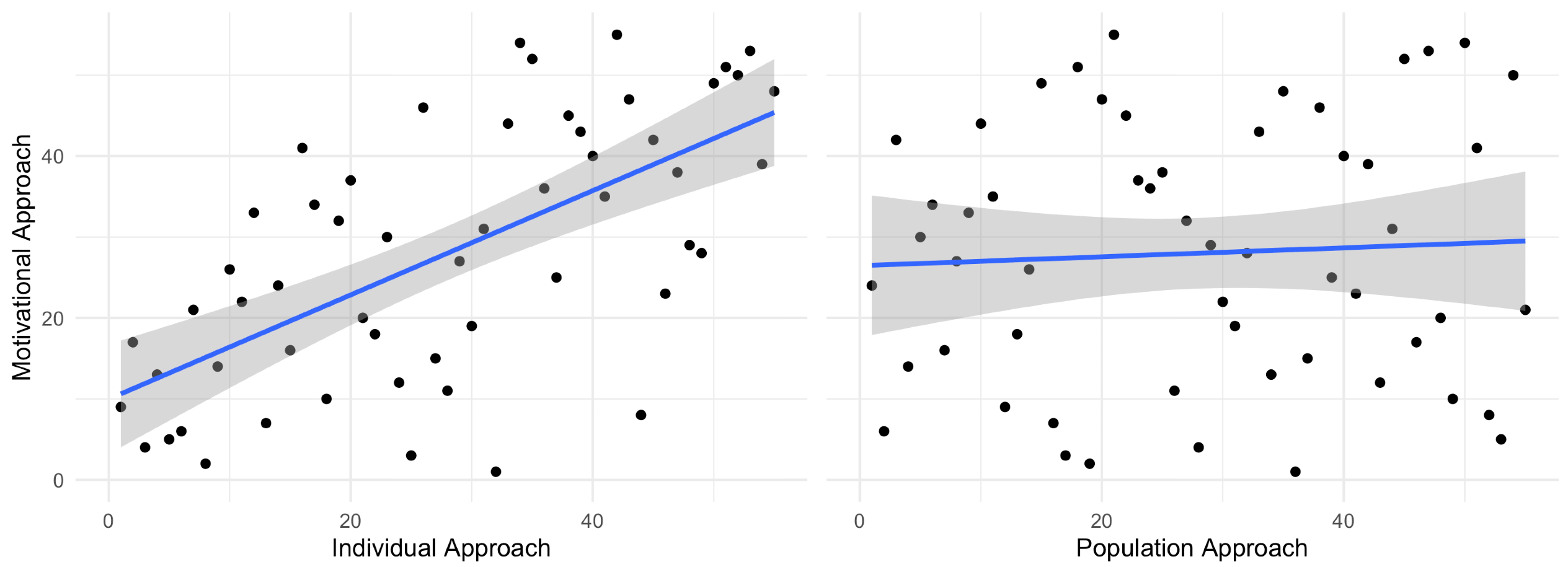 To test this, I used each of the three approaches to separately rank all the neighborhoods across New York City by the volume of displacement occurring there. For each approach, the neighborhood with the most amount of displacement was ranked 1 and the least amount was ranked 55. Figure 1 compares both the population and individual approaches against the motivational approach by plotting their rankings and a best-fit line. A 45-degree line would indicate perfect correlation—that two approaches identically ranked a neighborhood with the highest quantity of displacement, followed by the second-most displacement, and so on. While allowing for some degree of discrepancy between approaches, a good proxy should have a very high degree of correlation, suggesting that one measure could be substituted for another. The graphs below show correlations of individual versus motivational (statistically significant) and population versus motivational (not statistically significant). While the individual approach is a better approximation of the motivational approach, there is still a high level of divergence, suggesting that they are measuring two distinct things.