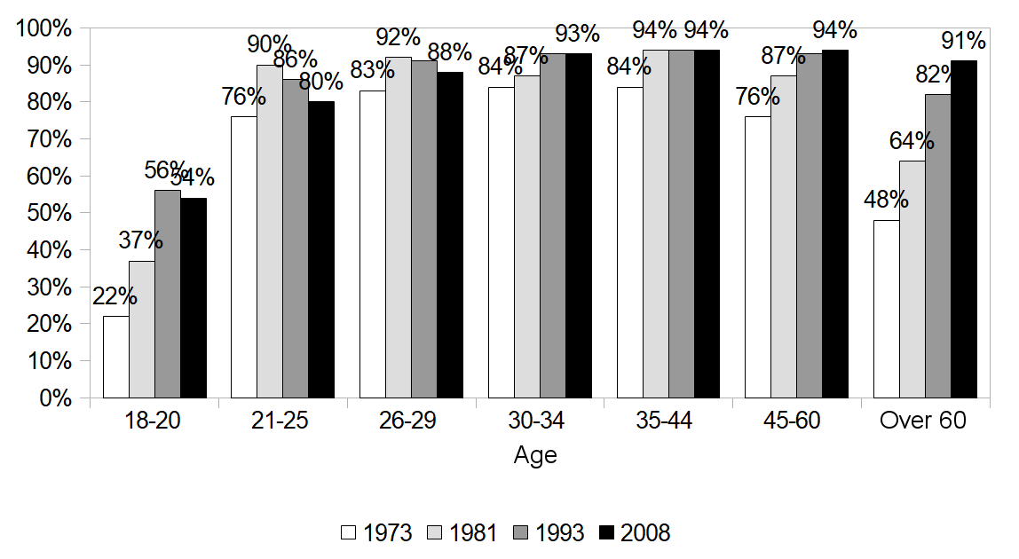 Interpretation : in 1973, 22 out of every 100 men aged 18 to 20 held a driver’s license.