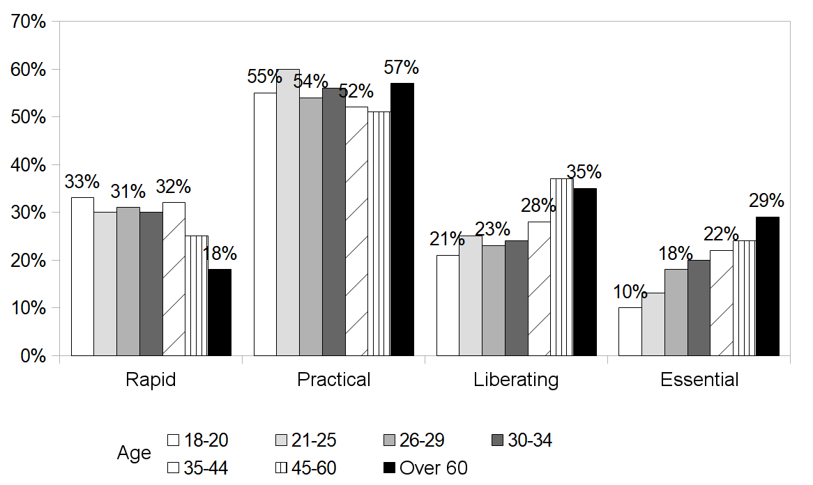 Interpretation : 33 out of every 100 individuals aged 18 to 20 thought that the motor car was a rapid mode of transportation.