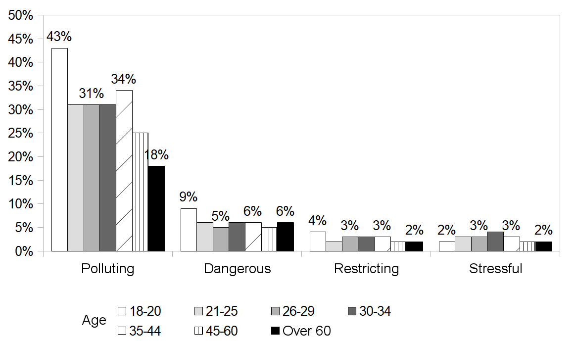 Interpretation : 43 out of every 100 individuals aged 18 to 20 thought that the motor car was a polluting mode of transportation.