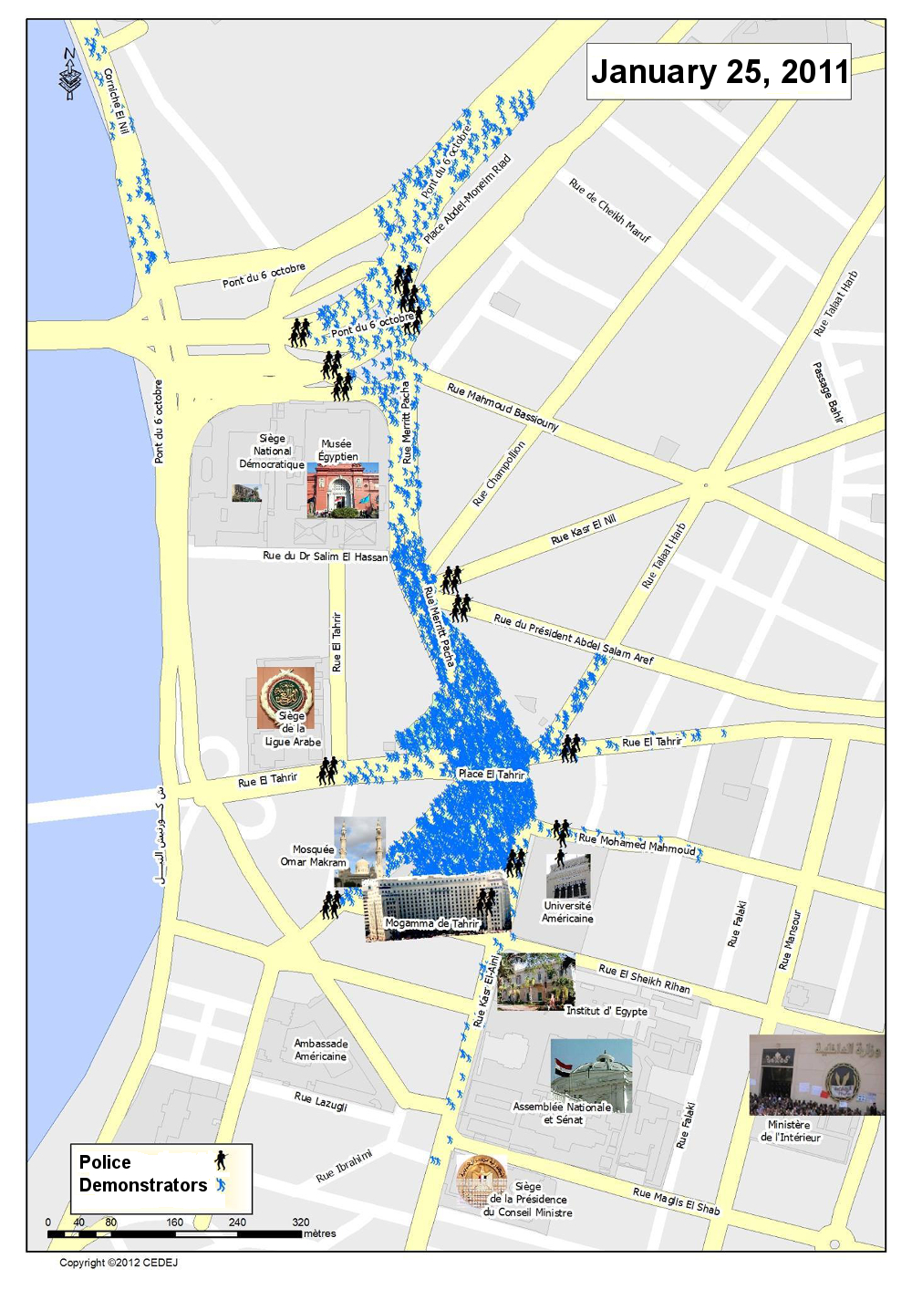 By the end of the 2000s, Egyptian activists had acquired a deep-rooted, practical sense of spatial constraints. They knew that choosing a protest site had several consequences. Depending on the location, the protest’s attractiveness to outsiders would vary ; the manageability of the protest by police forces would be more or less easy ; and the protest itself, depending on its morphology, would seem more or less important. Marching down narrow streets doesn’t feel or mean the same as demonstrating along broad avenues. The choice of starting points for the January 25, 2011 protests was the subject of intense debate among activists. Some wanted to stick to the usual spots in downtown Cairo, while others suggested departing from working-class neighborhoods in the city’s outskirts. (El Chazli 2012, pp. 85–88) They eventually chose to organize marches that would end on Tahrir Square, instead of calling for the usual sit-ins in front of the Journalists’ Syndicate or the High Court (Deboulet and Florin 2014). [2] The way in which the first protests were organized no doubt played an important role in their success.