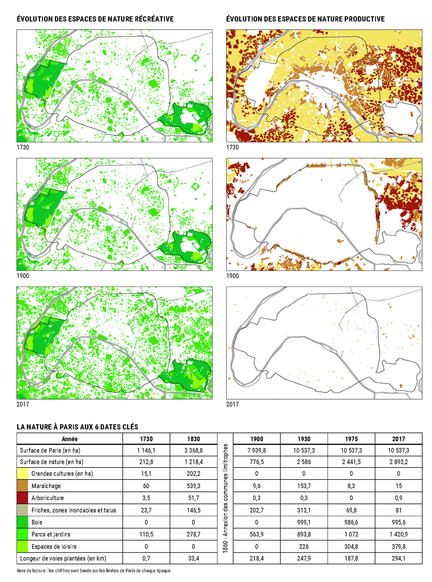 Source : Atelier parisien d’urbanisme, note 122, « Évolution de la nature à Paris de 1730 à nos jours », 2018, p. 3. URL : https://www.apur.org/fr/nos-travaux/evolution-nature-paris-1730-nos-jours. Cartographie réalisée dans le cadre de la recherche-action Naturpradi, Nature(s) urbaine(s) en pratique(s) digitale(s), coordonnée par LAA/LAVUE (UMR 7218, CNRS) et financée par l’AAP MODEVAL URBA, Ademe 2016-19.