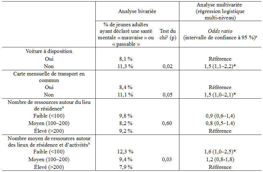 Les analyses statistiques indiquent aussi que le risque de déclarer une santé mentale « mauvaise » ou « passable » reste le même quel que soit le nombre de ressources commerciales et récréatives implantées à proximité du lieu de résidence (voir tableau 1). En revanche, si on considère le nombre moyen de ressources commerciales et récréatives situées à proximité des lieux fréquentés au quotidien par les individus (incluant leur domicile, mais pouvant aussi être en dehors de leur quartier de résidence), des associations statistiquement significatives apparaissent. Ainsi, le risque de déclarer une santé mentale « mauvaise » ou « passable » augmente à mesure que diminue l’accès aux ressources urbaines, et cette relation est indépendante du nombre de lieux d’activités rapportés. Ces résultats soulignent l’importance de l’espace d’activité et de sa variété pour identifier les différentes ressources avec lesquelles les individus sont en contact au cours de leurs déplacements quotidiens, les lieux de résidence ne constituant souvent qu’un des pôles de leur espace de vie.