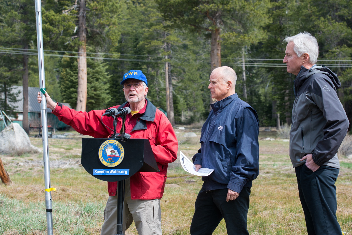 “You’re at the Phillips snow course for the April 1, 2015, measurement,” Frank Gehrke, chief of the California Cooperative Snow Survey program, told the crowd of reporters assembled in a barren field high in the Sierra Nevada Mountains. “And as you can clearly see, there is no snow at this location.”