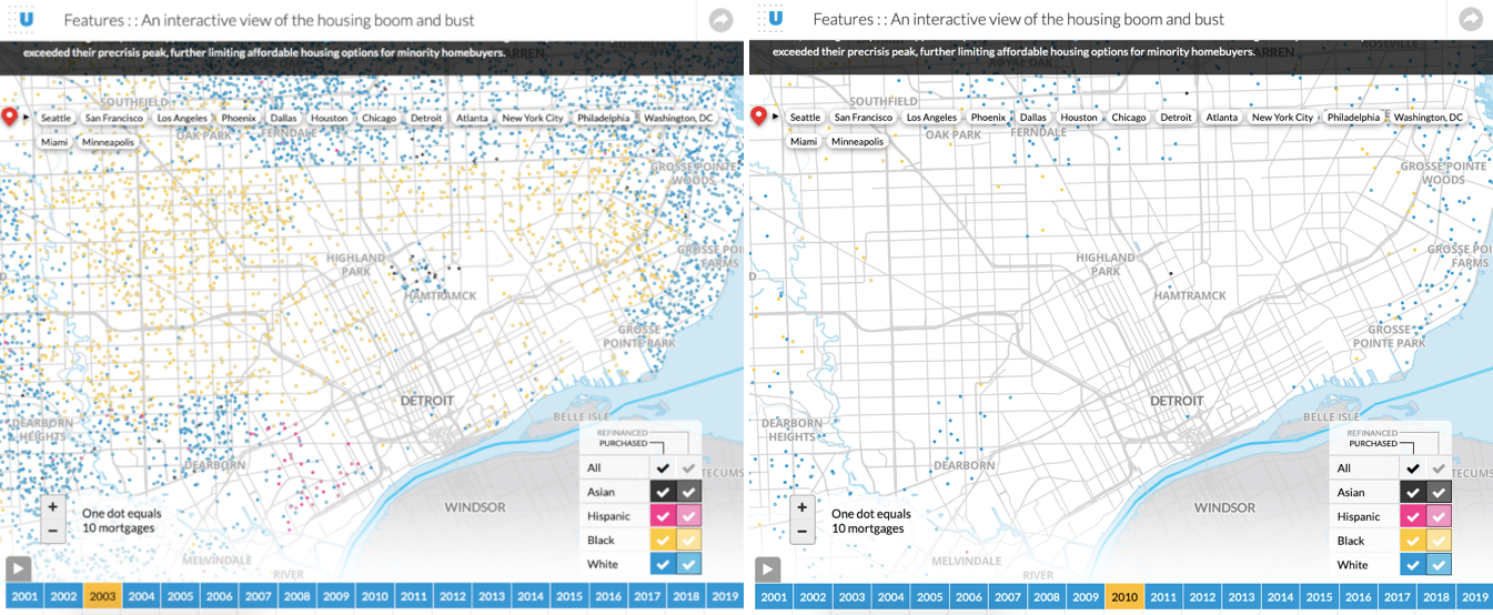 The map on the left for 2003 shows extensive subprime lending to Black and Hispanic Detroiters while the map on the right for 2010 shows only a few mortgages in the entire city.