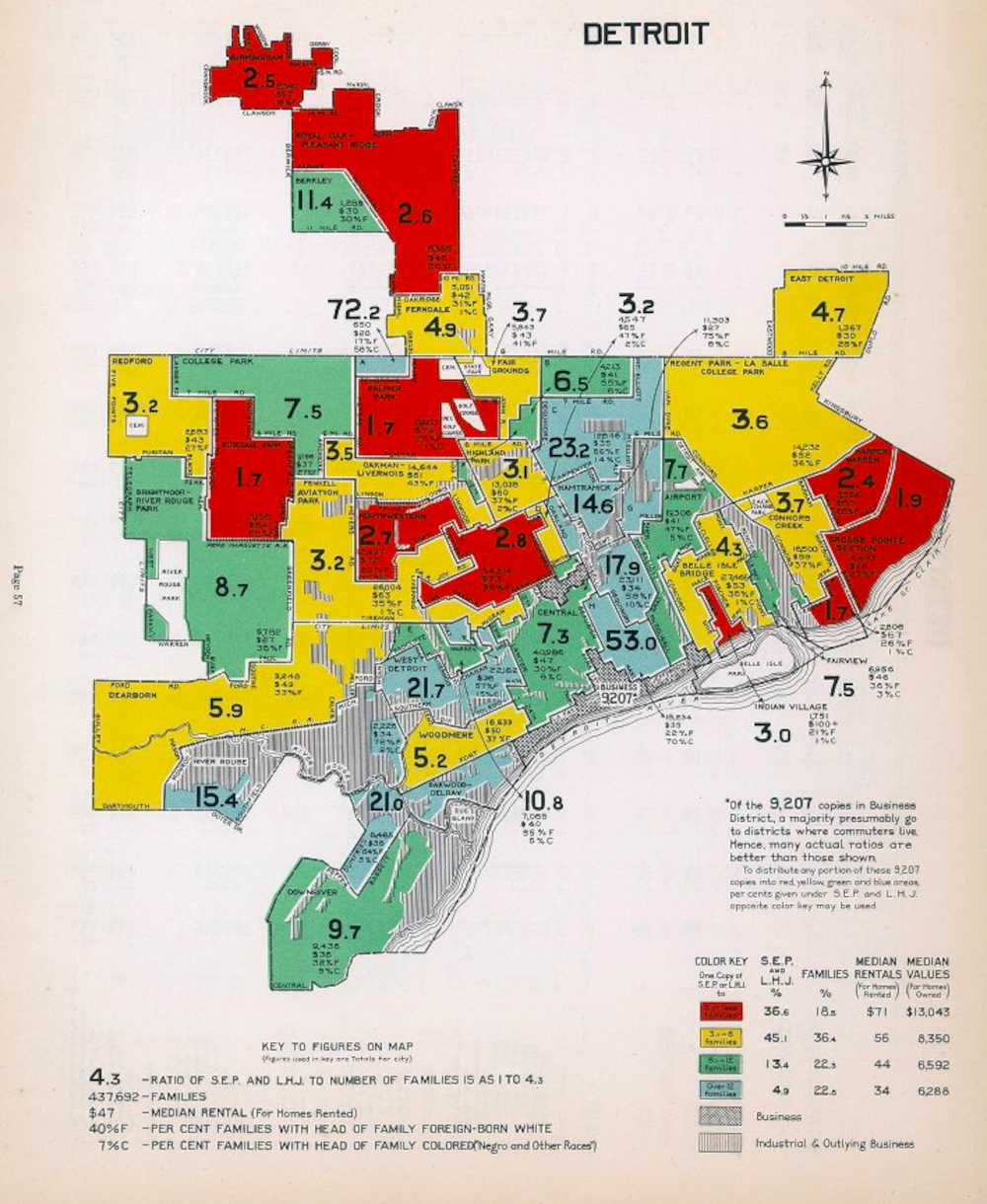 For nearly a century, retailers have used neighborhood classifications to avoid majority Black neighborhoods. The practice of “bluelining” is likely one of the earliest examples of retail spatial racism. Beginning in the 1920s, the Curtis Publishing Company and its newly established market research department developed a data-driven market analysis to develop maps for its door-to-door salesmen. It utilized variables such as circulation data for newspapers and magazines, auto sales, consumer goods, and transportation spending in order to classify neighborhoods. These maps targeted specific neighborhoods and expressly avoided others :