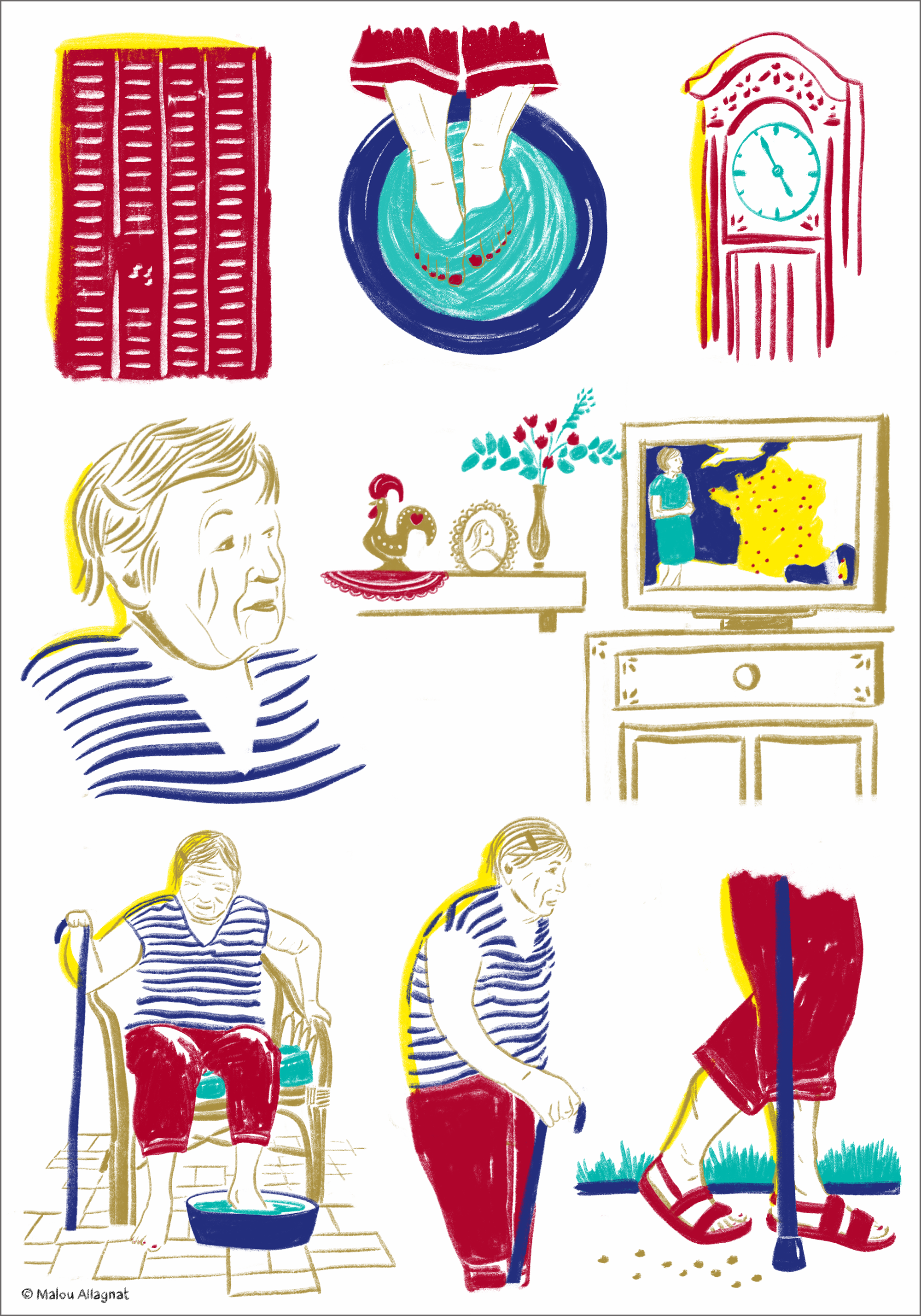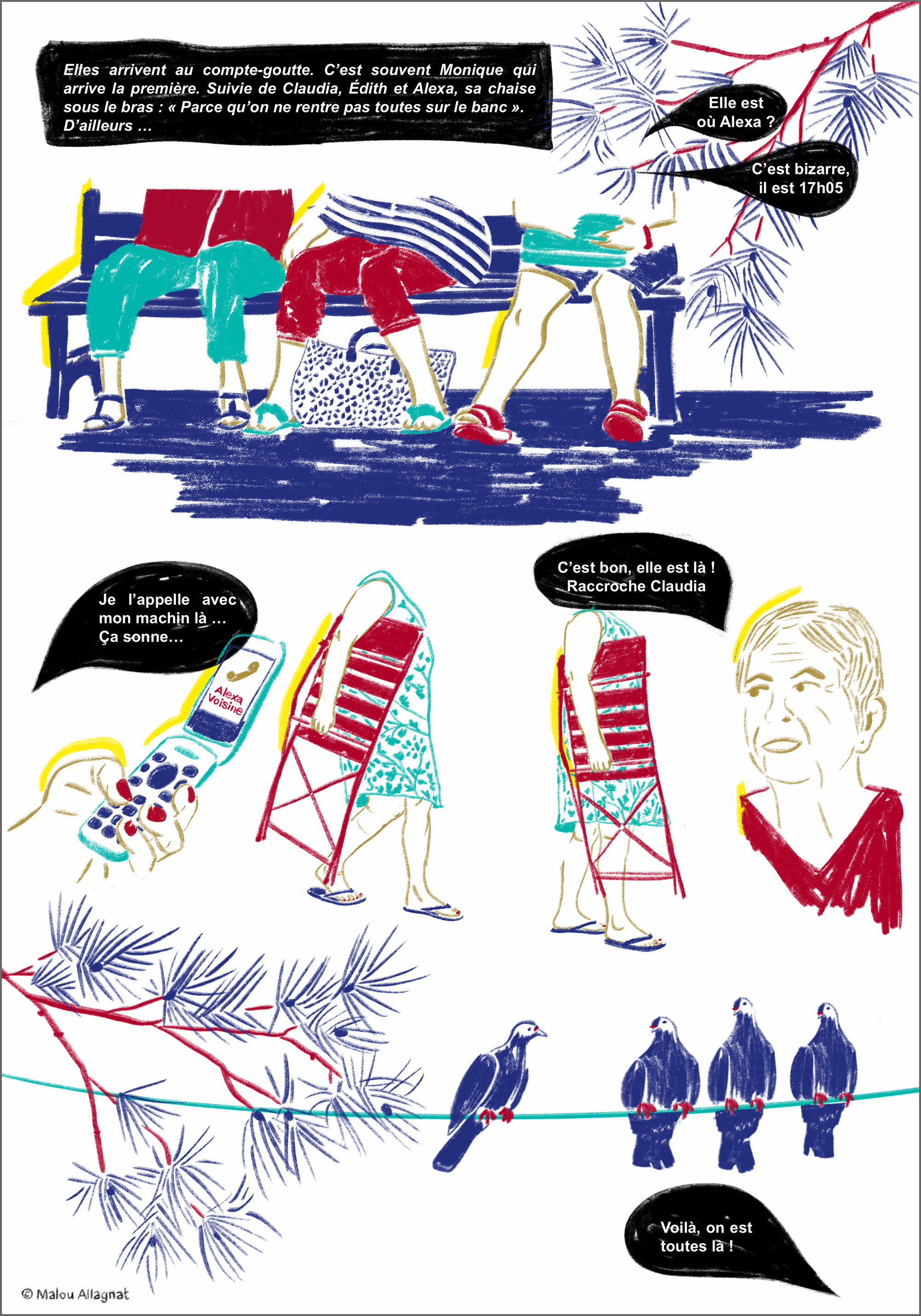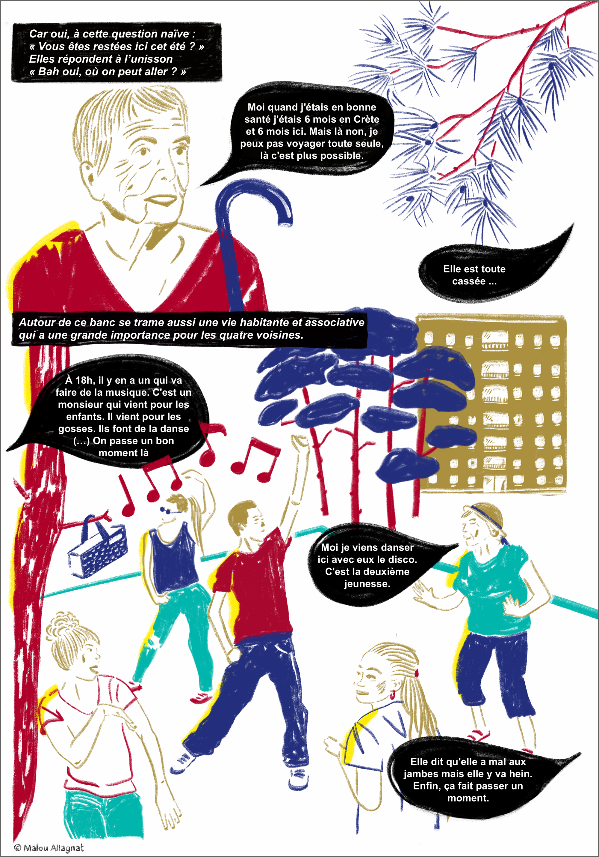 Le récit du banc à l’ombre se construit à travers les témoignages de ces quatre femmes âgées qui abordent le sujet de la chaleur par l’intermédiaire de leur immobilité, leur âge, l’importance du lien social et de la veille en période estivale… Ces paroles, mises en dessin ci-dessous [3], sont associées à l’ambiance d’une fin de journée d’été où les espaces publics se remplissent, où les habitants des tours alentour investissent peu à peu chaque interstice.