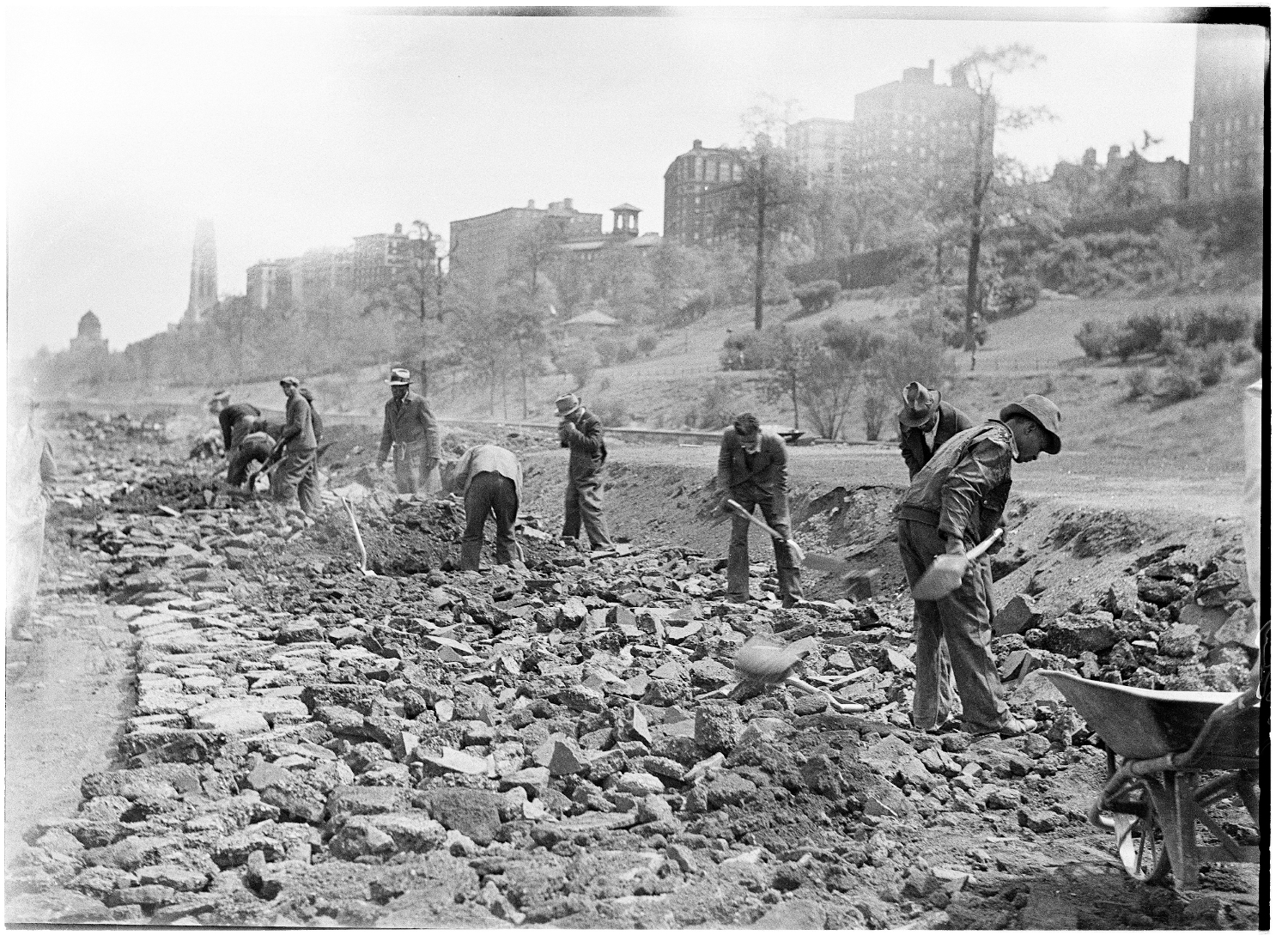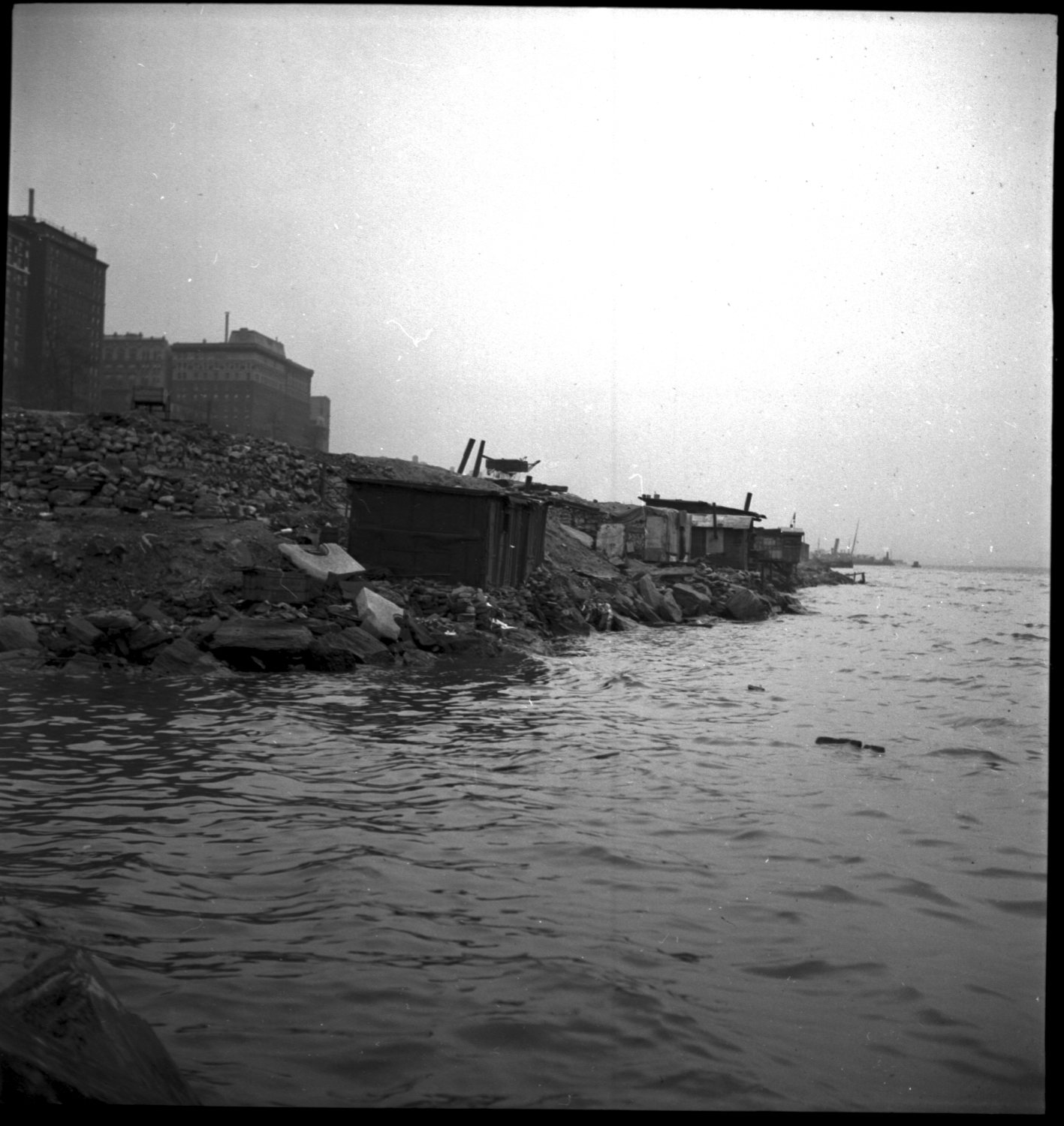 During the height of the Great Depression in New York City, the development of public parks diverted homeless people away from areas that would be taken over for recreational purposes, which the city understood as a more valuable use of space than the day-to-day survival of those living without traditional homes. Under Mayor Fiorello LaGuardia and Parks Department chief Robert Moses, the city took advantage of federal funding from the Works Progress Administration (WPA) photography project to visually catalogue areas where homeless people lived in squatters’ camps, as a prelude to park development. Photographs taken in the 1930s by WPA photographers were crucial to crafting the government’s narrative and “elicit[ing] sympathy” for the victims of the Depression (Dauber 2013, p. 91). But the lack of focus on the individual squatters in the photographs shows that homeless New Yorkers were not considered victims of an economic crisis, but rather objects to be displaced so that the land they occupied could be converted to serve a greater purpose. The expansion of Riverside Park, in northwestern Manhattan, offers one example. Photographers documented a site over the course of a year where photos of squatters’ shacks are replaced by images of a work crew digging a path along the river’s edge. As he did in many other instances, Moses effectively utilized green development to displace a squatter community. [1]