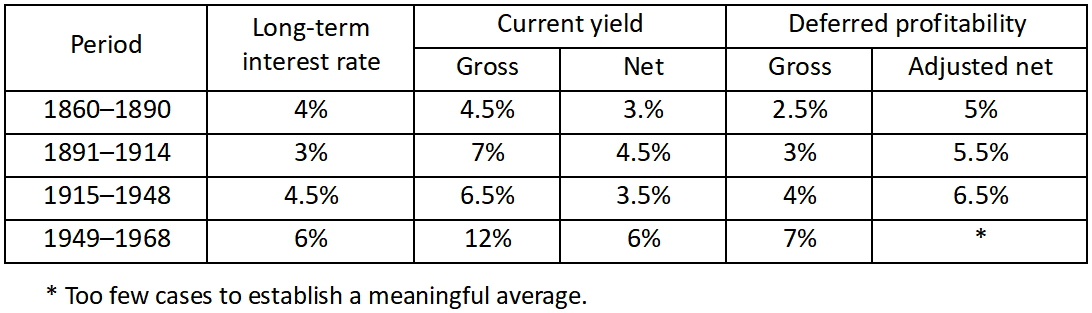 However, the results of our survey do not confirm this theory of falling real-estate returns. On the contrary, net returns remained high, as building prices adjusted to rents. To support this analysis, we rely on the measures of gross and net returns that have been possible to achieve. But this is only the first step. Indeed, the returns observed at the time of sale can be misleading for several reasons : an increase in rents improves it, major repairs deteriorate it, as well as a relative increase in the price at the time of sale compared to the rent. The historical perspective makes it possible to measure ex‑post profitability retrospectively, that is to say by taking into account all the income received by the owner over the period in which he owns the building (we shall call it “deferred profitability”). This was done in two ways : first, without taking into account the resale price (net deferred profitability), and second, by including it in the calculation (net deferred profitability plus). [12]
