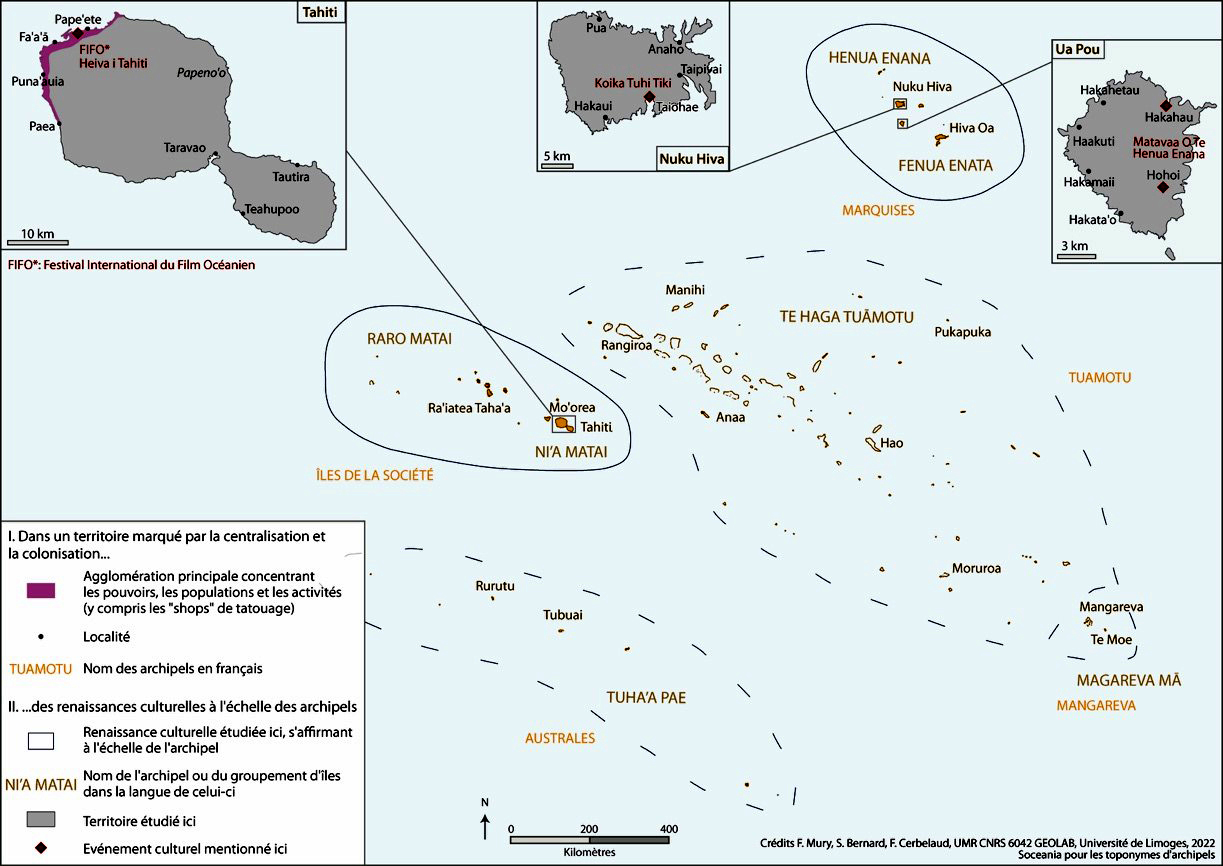 Longtemps réprimé par les pouvoirs coloniaux en Polynésie française, l’art du tatouage connaît un renouveau depuis les années 1970. Dans les « shops » (les salons de tatouage) de l’agglomération de Pape’ete, à Tahiti, et dans les compétitions de tatouage qui ont lieu régulièrement sur l’île, les motifs du patutiki sont omniprésents. En marquisien, le patutiki désigne l’art du tatouage qui s’est développé avant la colonisation dans l’archipel des îles Marquises (Henua Enana), à plus de 1 400 km de Pape’ete. De quelle construction territoriale la diffusion renouvelée du patutiki, à Pape’ete et ailleurs, est-elle le nom ? Pour y répondre, cet article mobilise un travail de recherche (figure 3, Mury 2022), d’entretiens notamment, mené de 2018 à 2021, à Tahiti et dans deux îles des Marquises (Nuku Hiva et Ua Pou).