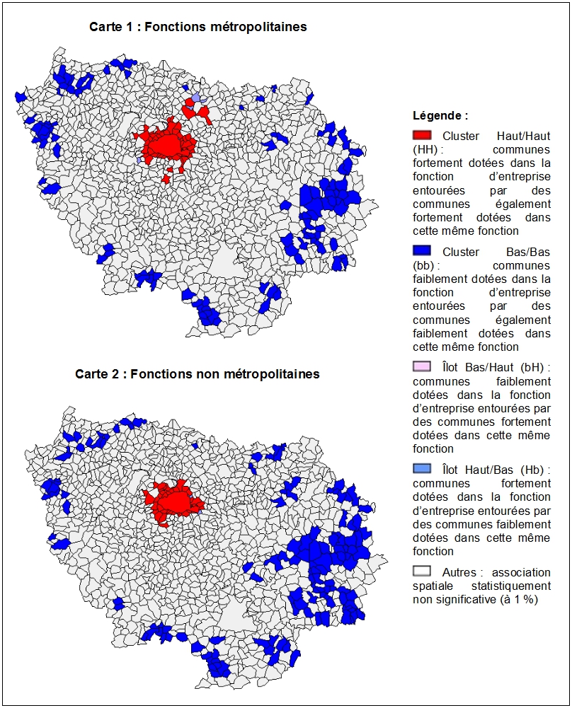 Elles opposent Paris et sa proche banlieue, bien plus dotées en emplois, au reste de la région Île‑de France (communes en rouge sur les cartes 1 et 2), et ce tout autant pour les emplois « métropolitains » que pour les emplois « non métropolitains ».