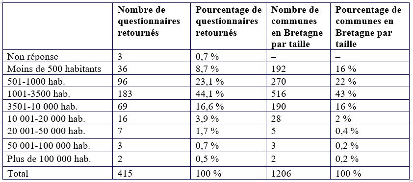 L’échantillon obtenu est représentatif des classes de communes présentes sur le territoire (tableau 1). La spécificité du système urbain breton (Le Bihan et Ollivro 1999, Le Couédic et Prigent 2014), nous invite à reconsidérer les catégories usuelles de définition d’une ville moyenne [3]. La Bretagne, dont les établissements humains se sont organisés à partir des campagnes dès le VIe siècle, puis des petites villes dès le XIIe siècle, se caractérise par un maillage dense de centralités urbaines de tailles diverses [4]. Un ensemble de villes, comprises entre 3 500 et 10 000 habitants, et que l’on peut qualifier d’intermédiaires (Carrière 2008), y jouent historiquement un rôle important, du fait d’une bonne accessibilité aux services de santé, à la culture, aux sports, aux loisirs et aux aménités environnementales.