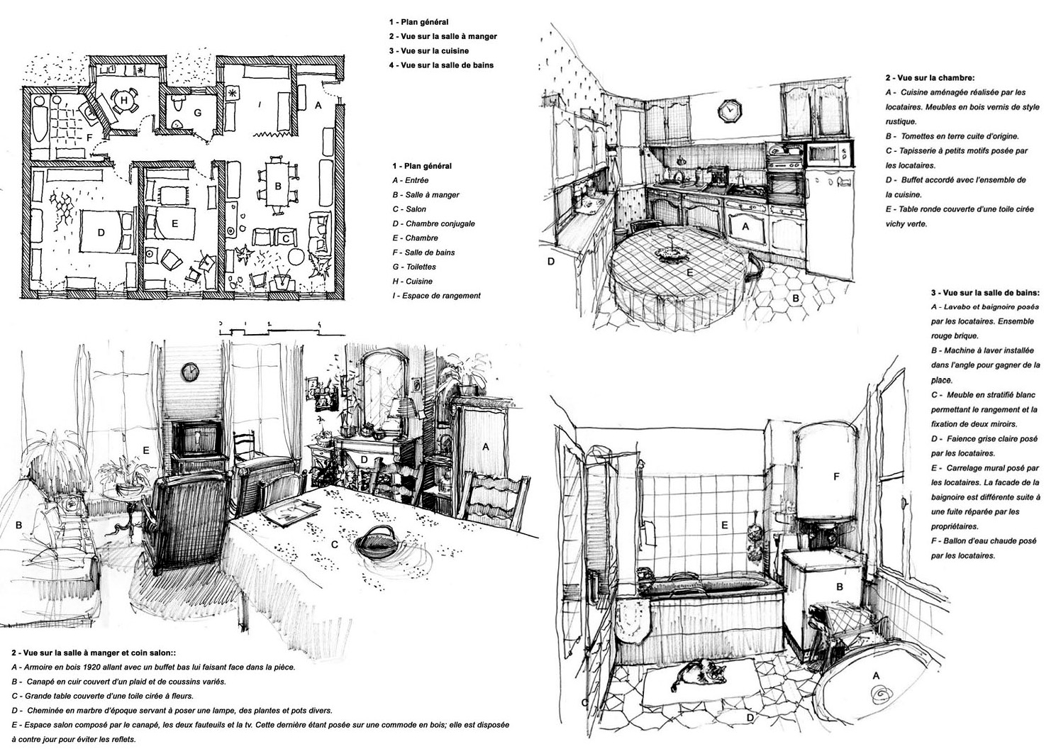 En 2015, ces travaux ont porté cette fois sur les modes d’habiter et les résistances habitantes [4]. Ils ont complété les données collectées auparavant à travers une quinzaine d’entretiens auprès des habitant·e·s du parc social et privé (un second passage pour certains) et de commerçant·e·s, ainsi que de nouveaux relevés habités.