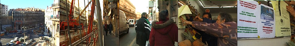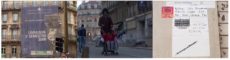 Les Indésirables de la rue de la Républiques (2008) de Patrick Taliercio fait suite à d’autres films du même réalisateur [11]. Des habitant·e·s mécontents présentent la réhabilitation comme une entreprise de spéculation immobilière destinée à les chasser. Le documentaire fonctionne sur des entretiens en plans fixes, des archives et des moments tournés en situation, notamment lors d’une visite de Renaud Muselier, président d’Euroméditerranée, dans les bureaux de Marseille-République. Le montage participe à mettre en scène des positions diamétralement opposées. Les propos des habitant·e·s et commerçant·e·s servent de réplique mot pour mot au discours de Renaud Muselier, et ainsi le contredisent.