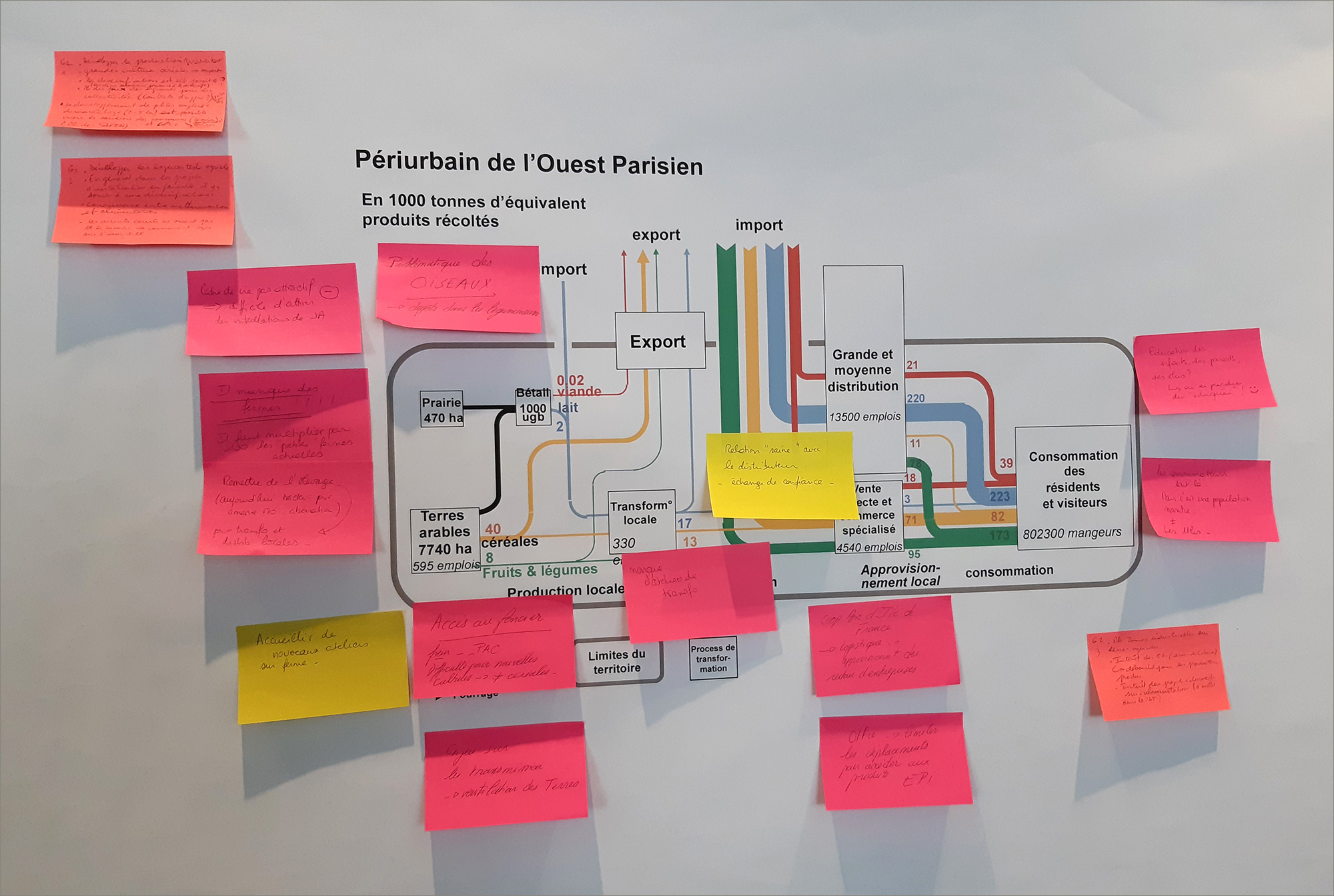 En septembre 2022, un atelier de deux jours a été proposé par des chercheuses et chercheurs [2] du projet Torsades [3] à des personnes concernées et parfois engagées dans la transition agricole et alimentaire de trois territoires. L’atelier a d’abord proposé une analyse de la situation actuelle par des regards croisés entre territoires, en s’appuyant notamment sur des « schémas de flux » (Billen et al. 2014) (figure 1). Ces schémas mettent en évidence les relations au sein d’un territoire à partir d’une représentation de la circulation de la matière agricole de sa production à sa consommation ou sa sortie du territoire. L’atelier a, dans un second temps, porté sur la construction de récits pour le futur, à partir d’un travail créatif des sous-groupes d’acteurs·rices de chacun des territoires. Plutôt que de construction de scénarios, il s’agit ici d’une mise en mots collective d’un futur souhaitable à partir d’une analyse et d’une lecture critique partagée du présent et de ses limites. L’approche narrative est privilégiée. C’est un exercice de prospective qui « constitue un va-et-vient entre le présent et le futur, non pas pour prédire celui-ci mais plutôt pour aider une société à se construire un avenir désiré » (Tabarly et Honegger 2009).