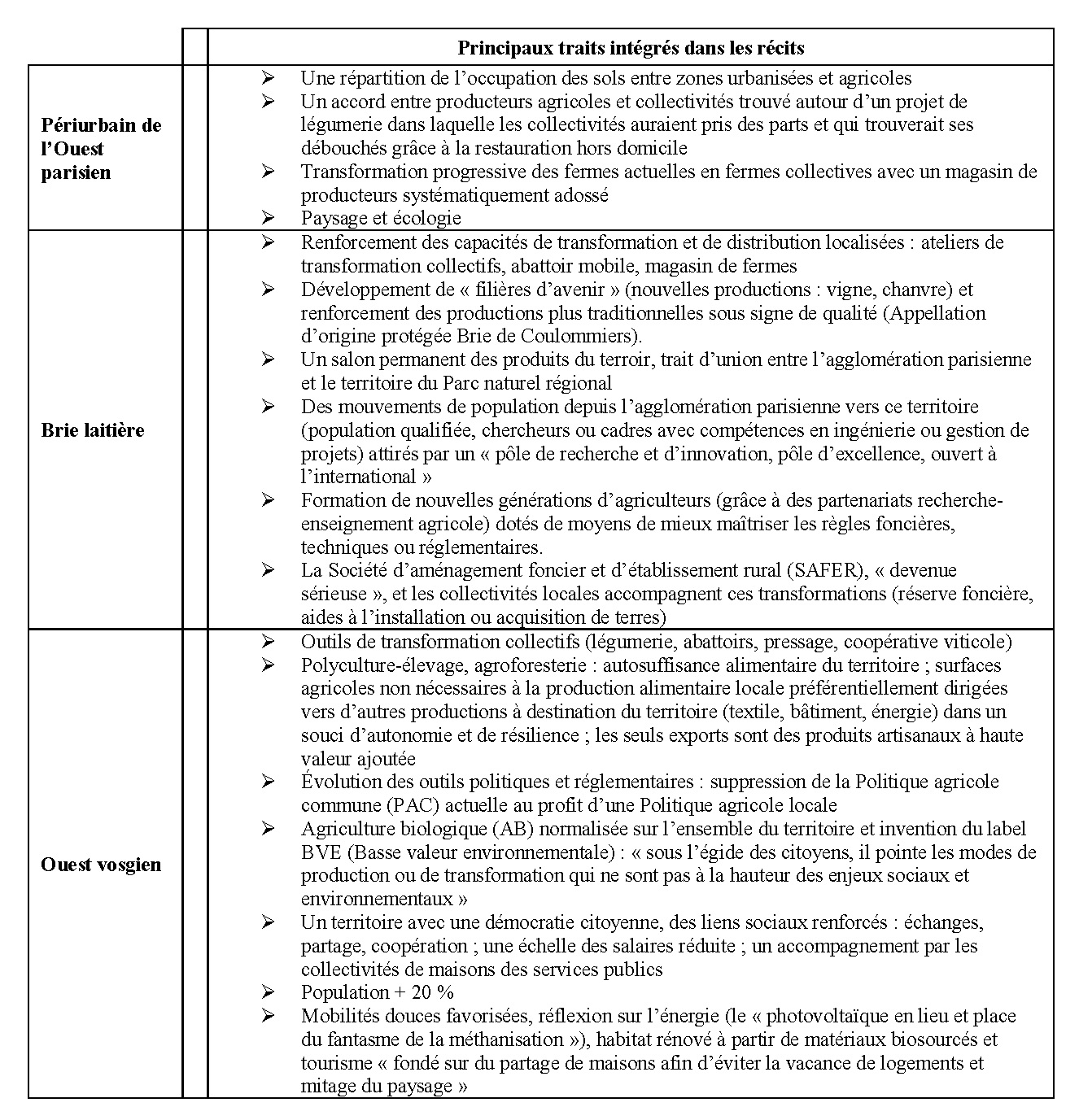 L’atelier a été pensé pour permettre un exercice de prospective à partir d’une restitution d’une partie des résultats issus de la première phase du projet Torsades : ceux relatifs aux flux de matières associés au fonctionnement actuel du système agri-alimentaire dans chacun de ces territoires, depuis la production jusqu’à la consommation. Présentée lors de l’atelier, cette analyse des systèmes agri-alimentaires met en évidence certaines spécificités territoriales (rural/périurbain ; démographie, emploi et économie ; place et type d’agriculture) mais aussi plusieurs points communs, parmi lesquels le déficit d’outils de transformation comme frein à la reconnexion agriculture-alimentation et des systèmes globalement très ouverts (plus de 80 % de la production agricole exportée et plus de 80 % de l’alimentation importée) (Barataud et al. 2022). Sur cette base, les participant·es à l’atelier, réparti·es en trois groupes correspondant à leurs territoires d’origine, ont alors été invité·es à « imaginer leur territoire en 2050 lorsque la reconnexion agriculture-alimentation aurait abouti » et à « présenter le chemin parcouru et le résultat réussi à une délégation voisine venue les rencontrer ». Le tableau 1 synthétise les principaux traits caractéristiques des récits ainsi produits pour chacun des territoires.