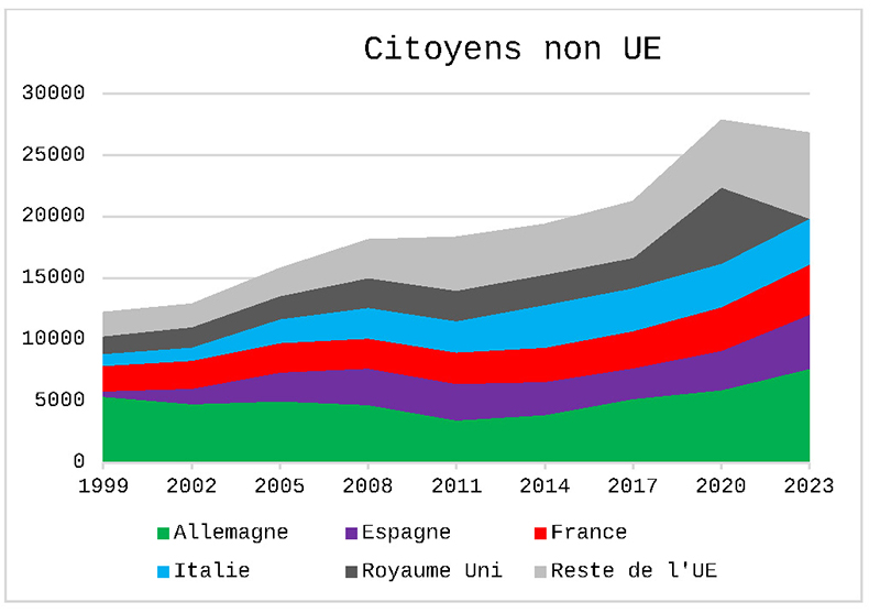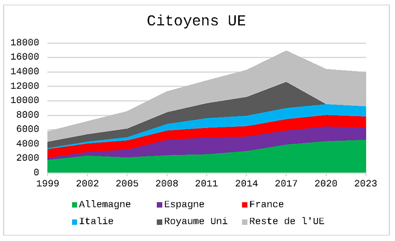 Notes : Les citoyens des pays EFTA sont inclus, ayant accès au droit de libre circulation. Les données pour Malte et Chypre ne sont pas disponibles. Les données pour la France de 2005 sont relatives à des années contiguës. Les données pour l’Espagne en 2023 n’incluent pas les citoyens de douze pays (AT, CZ, CY, EE, HR, HU, IS, LI, LU, MT, SI et SK). Les données sur les citoyens suisses en Espagne sont de 2021. Pour le Danemark, la Pologne et la Croatie, les dernières données sont de 2022 ; pour la Grèce, de 2021.