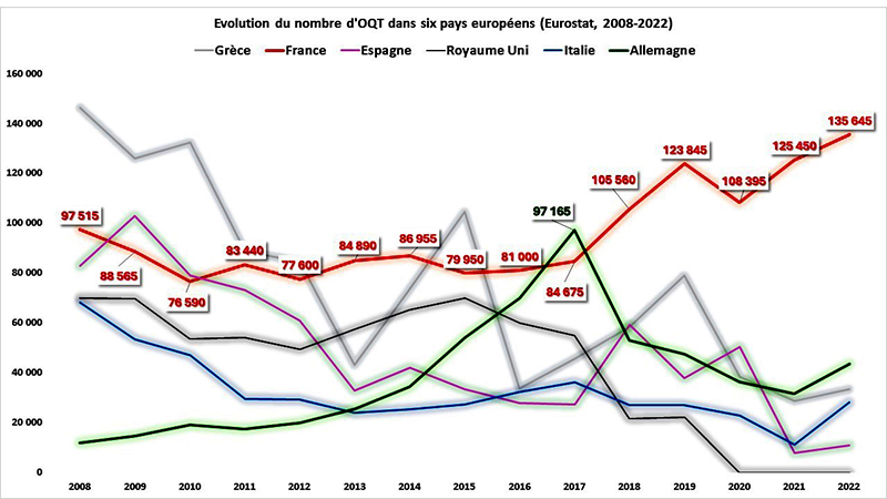 Cet article se fonde sur deux constats statistiques et propose un nouveau prisme d’analyse pour les études migratoires. Le premier de ces constats est que la France, comparée à d’autres grands pays européens, attire moins d’étrangers, qu’ils soient citoyens européens ou non. Cette tendance est stable durant les deux dernières décennies. Le deuxième constat est celui d’une « exception française » de nature administrative, qui demeure peu connue : la France délivre le plus grand nombre d’Obligations de quitter le territoire (OQTF) de toute l’Europe. À partir de ces deux constats, nous lançons un débat sur les indicateurs internationaux « d’attractivité » migratoire : puisque des pays ayant la même proportion d’étrangers peuvent avoir des comportements politico-administratifs très différents à leur égard, nous plaidons pour l’introduction d’un indicateur de « répulsivité ».
